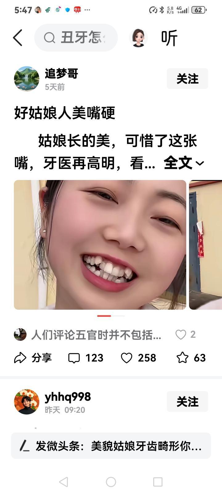 美貌姑娘牙齿畸形你怎么看这个丫头是个富贵命,她的牙齿最少也得有三十八颗,人们都说人的牙齿越多命越好,这是真的,我验证过,这样的牙齿不用矫正,姑娘笑的时候嘴不要咧那么大就行,挺好看的。
