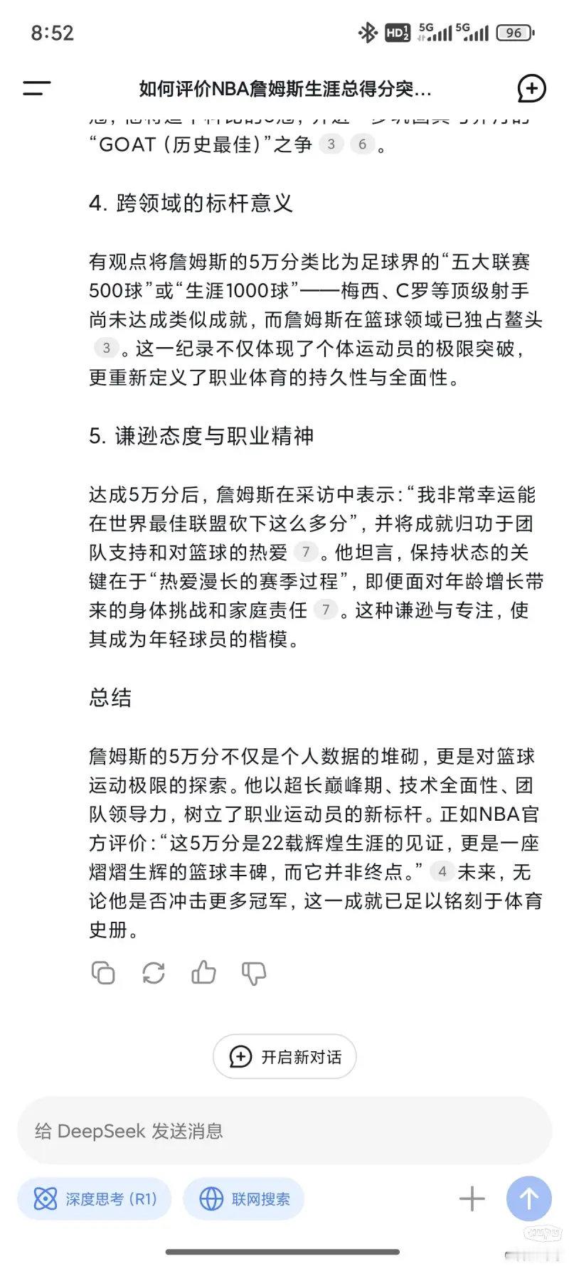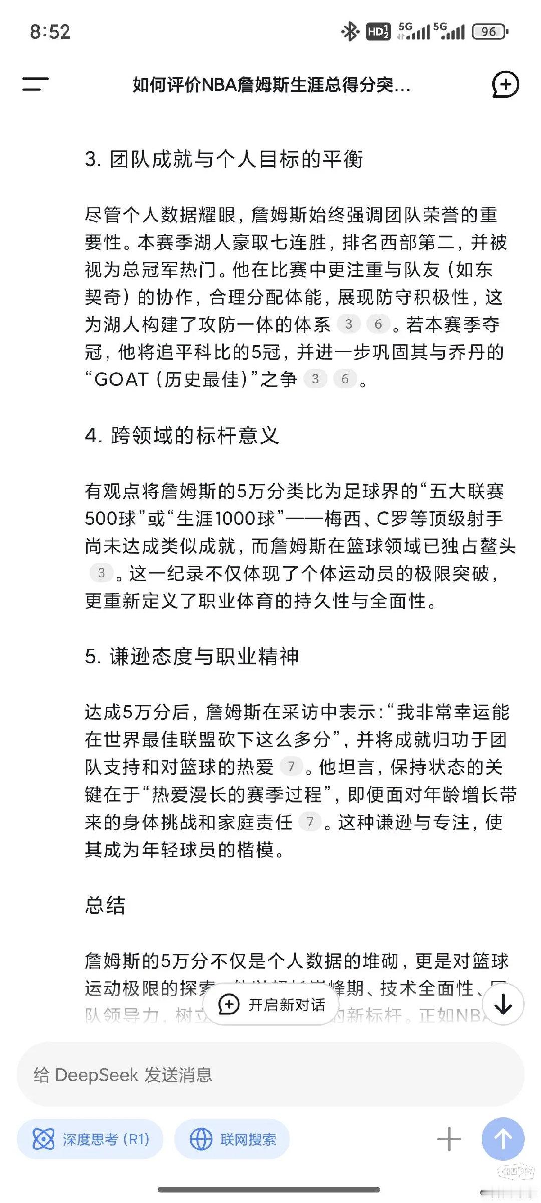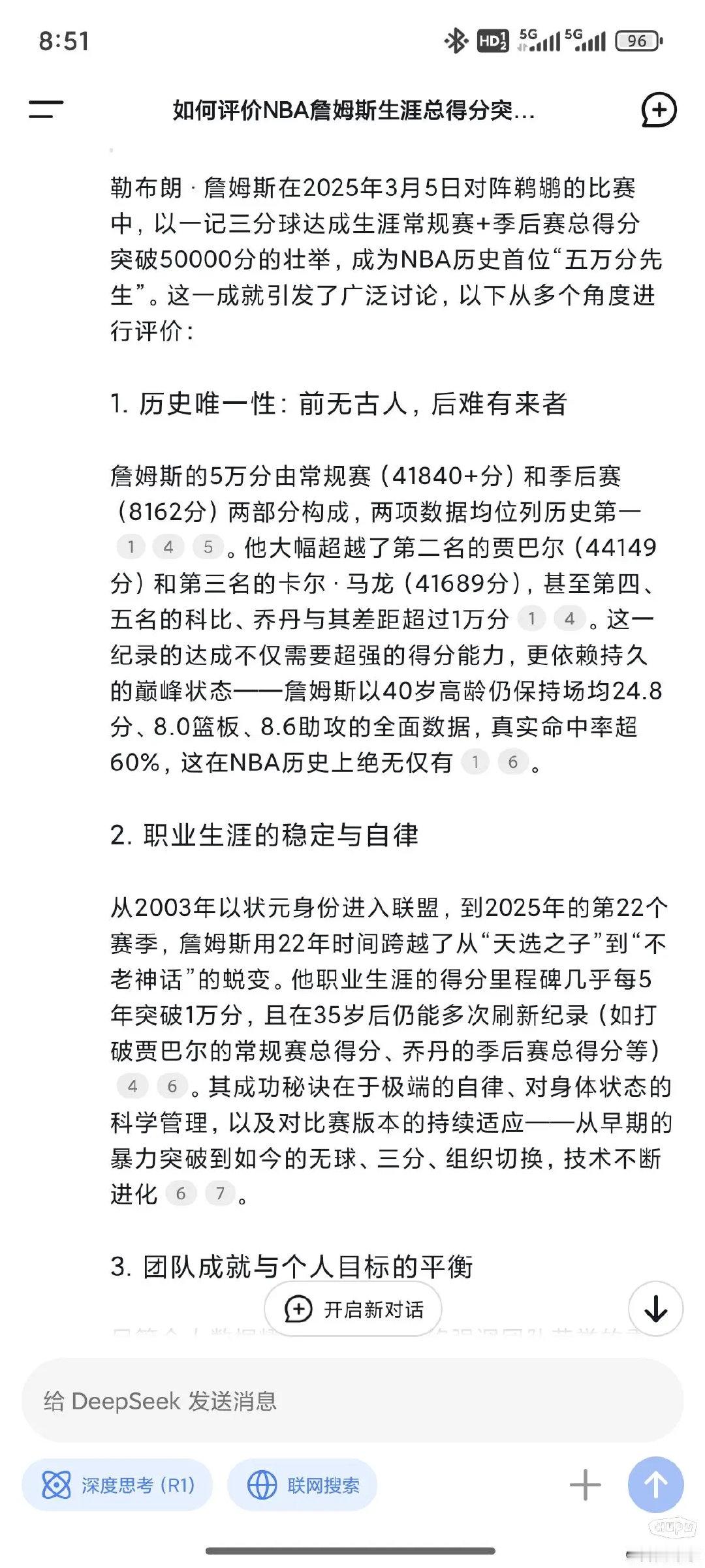 DeepSeek如何评价詹姆斯NBA职业生涯超5万分?