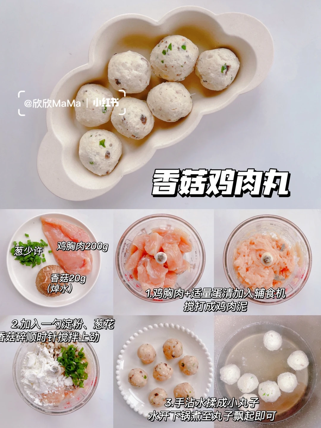 1⃣鸡胸肉加适量蛋清辅食机搅打成肉泥