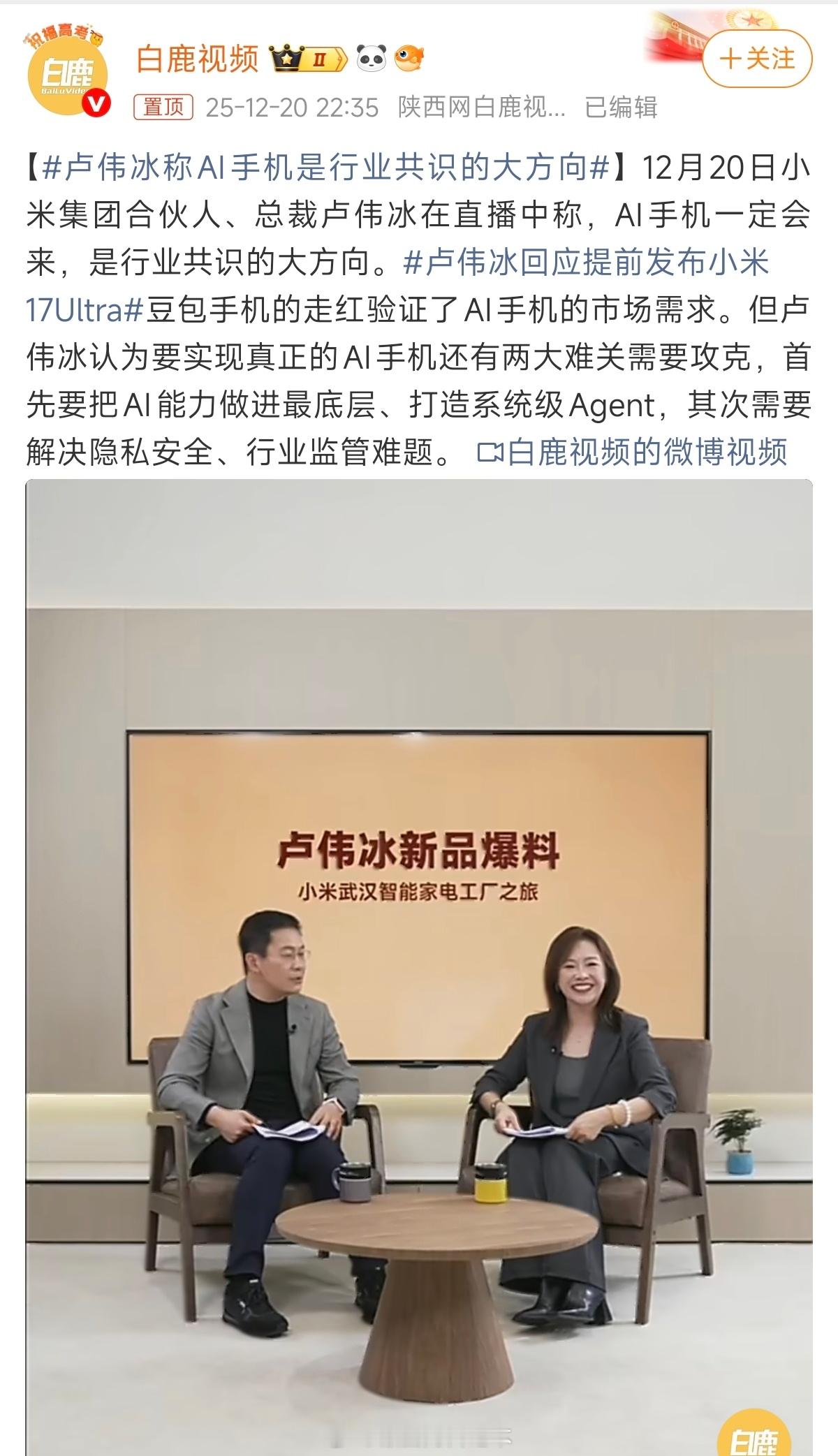 卢伟冰称AI手机是行业共识的大方向前一段时间豆包手机每天都霸占热搜,相信大家都