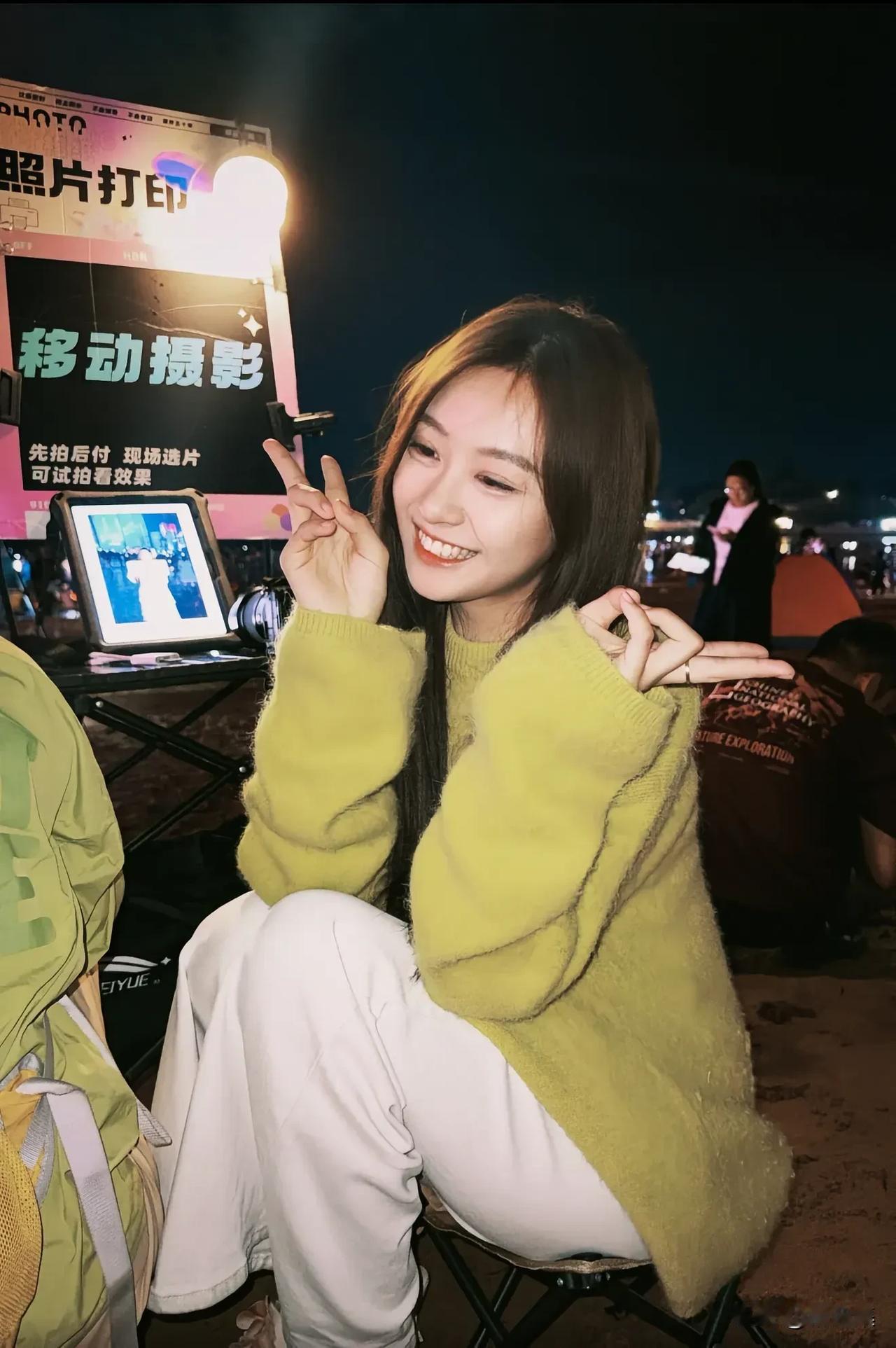 夜晚街拍,温暖黄色毛衣,甜美笑容,轻松自在。