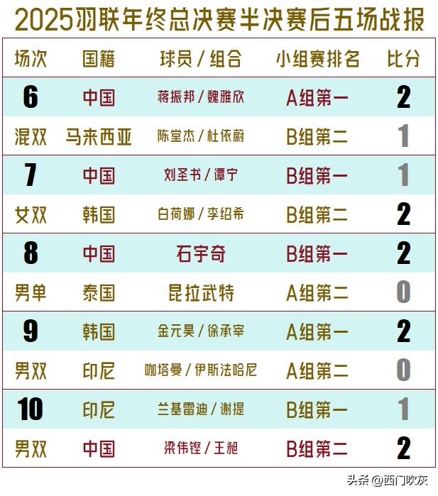 【倒反天罡有梁王!后五场半决赛两场赢得二番战!】 2025世界羽联年终总决赛半决赛昨晚收官,后五场比赛有三组二番战,其中男双收官战和女双次场都实现了复仇。 国羽四场比赛赢了三场。 这样,世界羽联年终总决赛五项比赛中四项都有中国球员杀入决赛。
