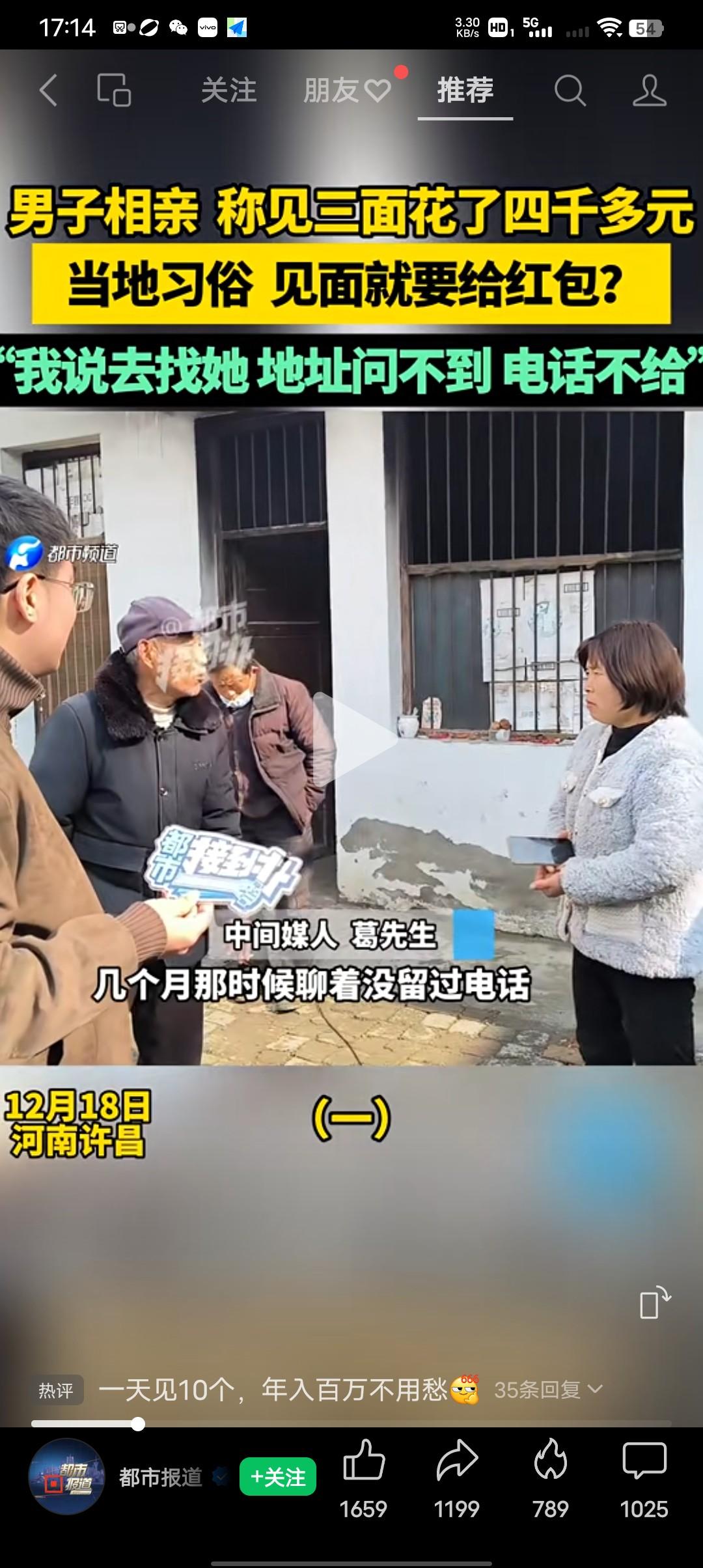 这妥妥的就是相亲骗局! 男子相亲称就见过三次面给女方花了4600元, 结果地址找不到电话不给,是不是相亲骗局? 陈先生:“我们就见了三面,我给女方花了4600多块钱,第一次见面,中间介绍人说是要给女方准备2千块钱的红包,中间介绍人说是他们那里的规矩,第二次媒人领着她来我家又让我给包了一个2千元的红包,见了三次面,花了4600,结果我想去找她的时候,地址也没问到电话也不给” 中间媒人葛先生:你聊了好几个月都没留过电话? 我觉得这明显的就是相亲诈骗嘛,刚见面就包2千元的红包,说是规矩,我觉得就是当地媒人吵出来的规矩,这生意好啊,见一面就有2千块钱,一天如果能接十个的话,真的是个好生意呢,而且还是一本万利。 不过我觉得这个生意好像还是有风险的,因为总有一天会为这样的行为付出代价这属于假诈骗,如果不及时收手到最后肯定要负法律责任的!