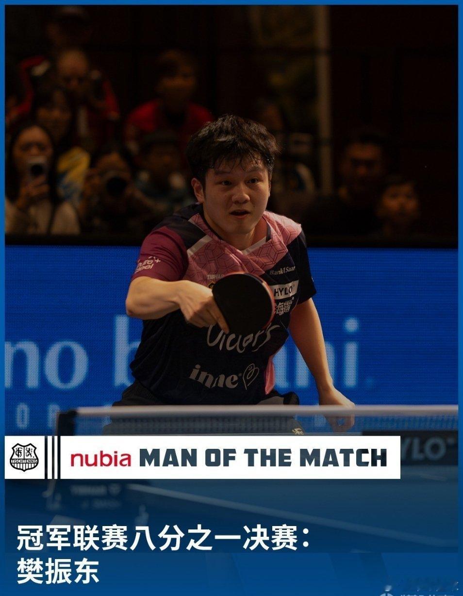 樊振东当选欧冠本场最佳球员樊振东 官方:樊振东以96%得票率当选欧冠八分之一决赛全场最佳球员。北京时间12月21日,萨尔布吕肯乒乓球甲级俱乐部发文宣布,樊振东以96%的得票率,当选欧冠八分之一决赛的nubia本场最佳球员!原文如下:球迷们已经投票决定:樊振东以 96% 的得票率 当选欧冠八分之一决赛的 nubia 本场最佳球员!🏓💥感谢所有参与投票的球迷,也恭喜樊振东!👏下一轮投票将于周日开启,欢迎大家继续参与,一起选出你心中的最佳!💙🖤(完)【1/8决赛第二回合 萨尔布吕肯(主场) 3-0 比亚韦斯托克】第一盘,樊振东 3-0 霍多尔斯基(11-1,11-5,11-5);第二盘,约奇克 3-0 霍伊诺夫斯基(11-3,11-4,11-3);第三盘,弗朗西斯卡 3-0 曾根翔(11-9,11-8,11-7)。