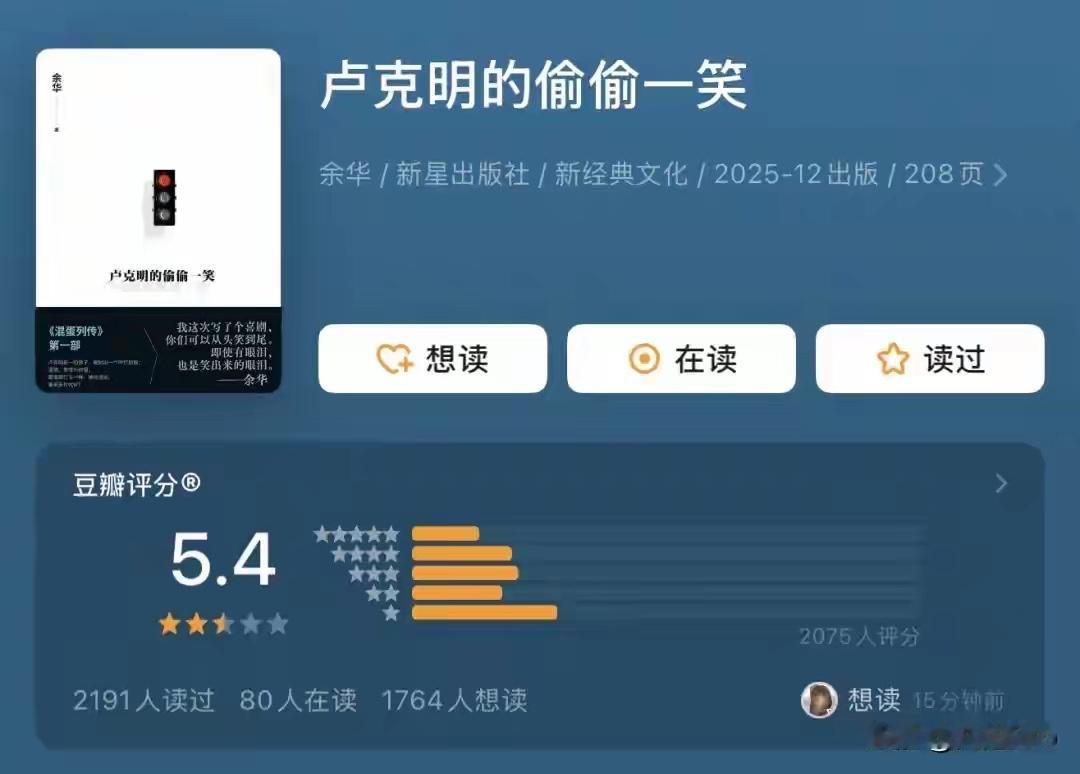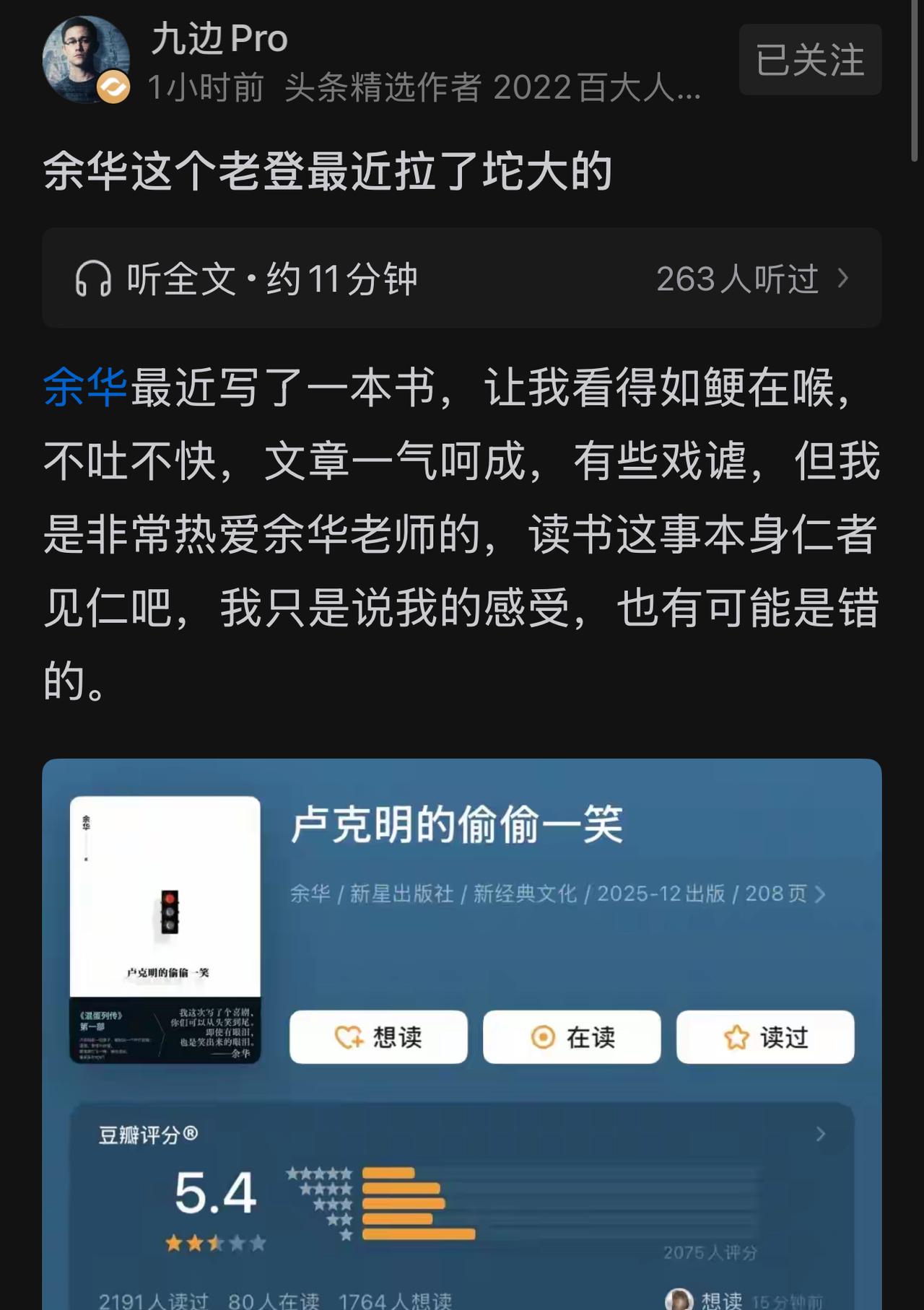 知名作家余华遇到大麻烦,这几天被互联网大V九边Pro猛烈批评! 起因是余华写了一本书《卢克明的偷偷一笑》讲述了一个男子与多名女子不正当交往,而且过着花天酒地的生活,九边Pro认为这部小说质量非常差,而且内容宣扬的东西有问题,他说余华这个老登的这部作品就像一大坨,他批评余华这部作品有些过分,大失水准!有看过余华这部小说的吗?