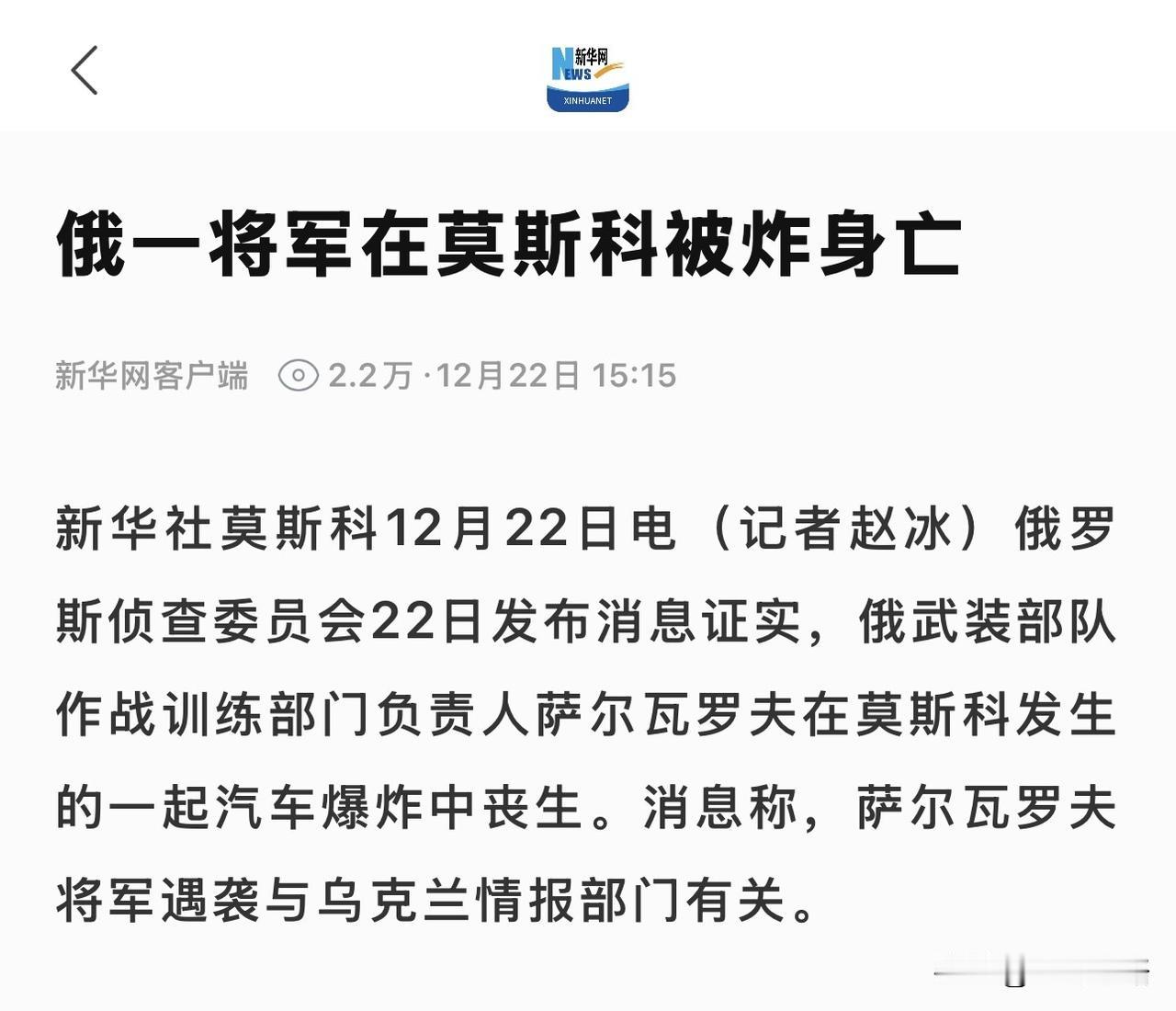 “俄罗斯八十万禁军总教头”被乌克兰暗杀?据新华社报道,俄武装部队作战训练部门负责人萨尔瓦罗夫在首都莫斯科死于一起汽车爆炸…… 萨尔瓦罗夫负责练兵,应该算是太尉了吧。这种高级将领在自己国家首都被杀,证明乌克兰对俄罗斯的渗透超乎想象。 俄罗斯应该很快就会针对乌克兰采取报复。 乌克兰继续抵抗是对的,欧盟东拼西凑900亿欧元给乌克兰,至少能让泽连斯基再坚持大半年。 俄乌战事不能停,不能让俄罗斯输,更不能让俄罗斯大胜。 就这么继续消耗下去,美欧俄都不能脱身,是最好的局面。