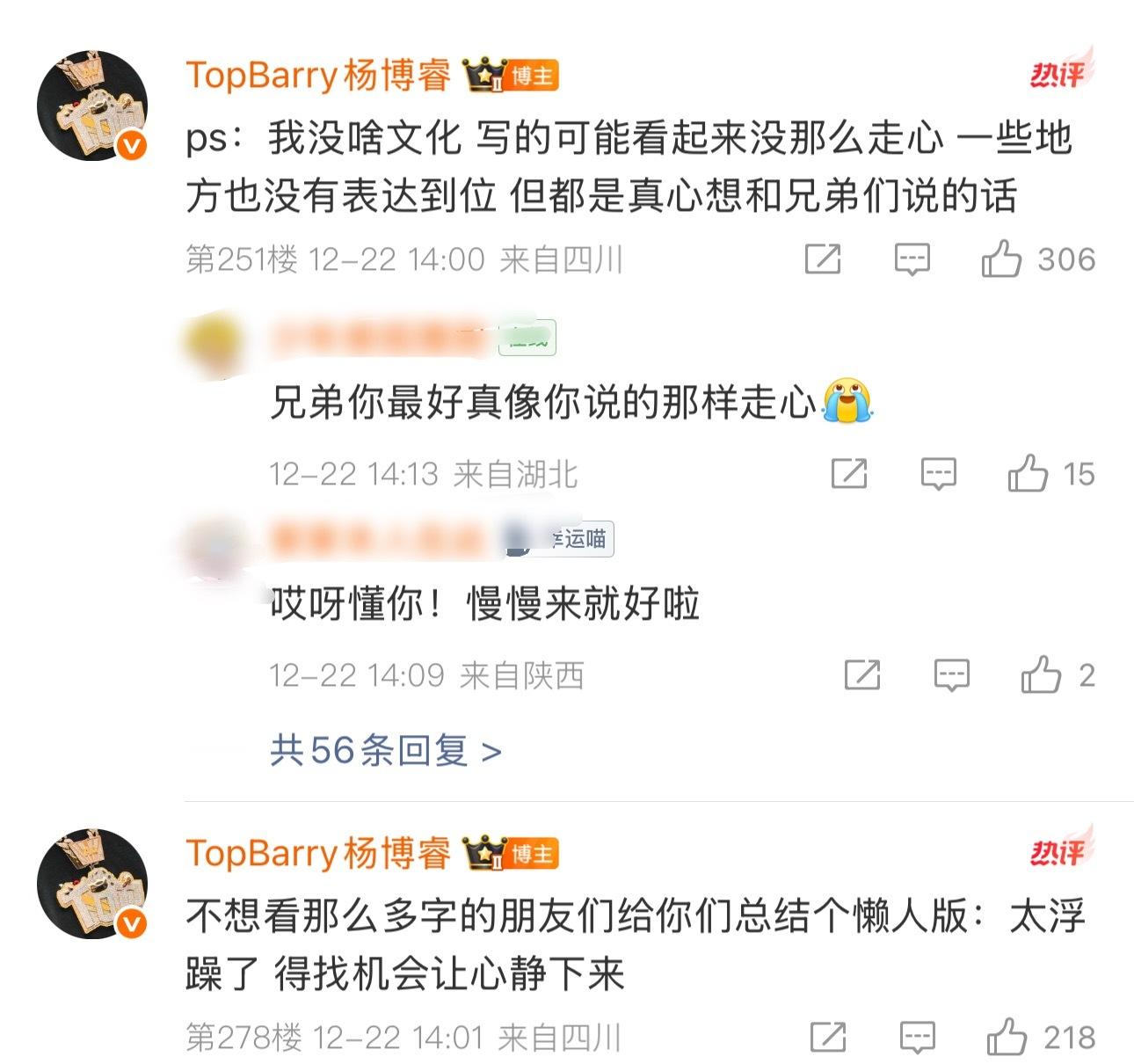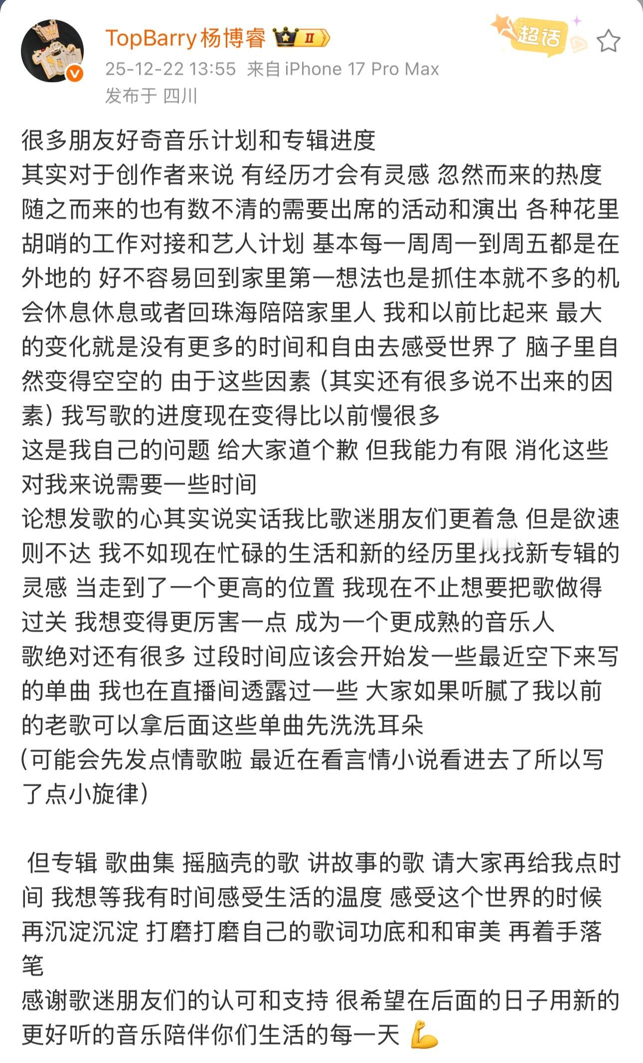 TopBarry发长文谈专辑进度!坦言走起来后自己太忙太浮躁,写歌变得很慢,并对此道歉:“这是我自己的问题 给大家道个歉 但我能力有限 消化这些对我来说需要一些时间当走到了一个更高的位置 我现在不止想要把歌做得过关 我想变得更厉害一点 成为一个更成熟的音乐人”TopBarry