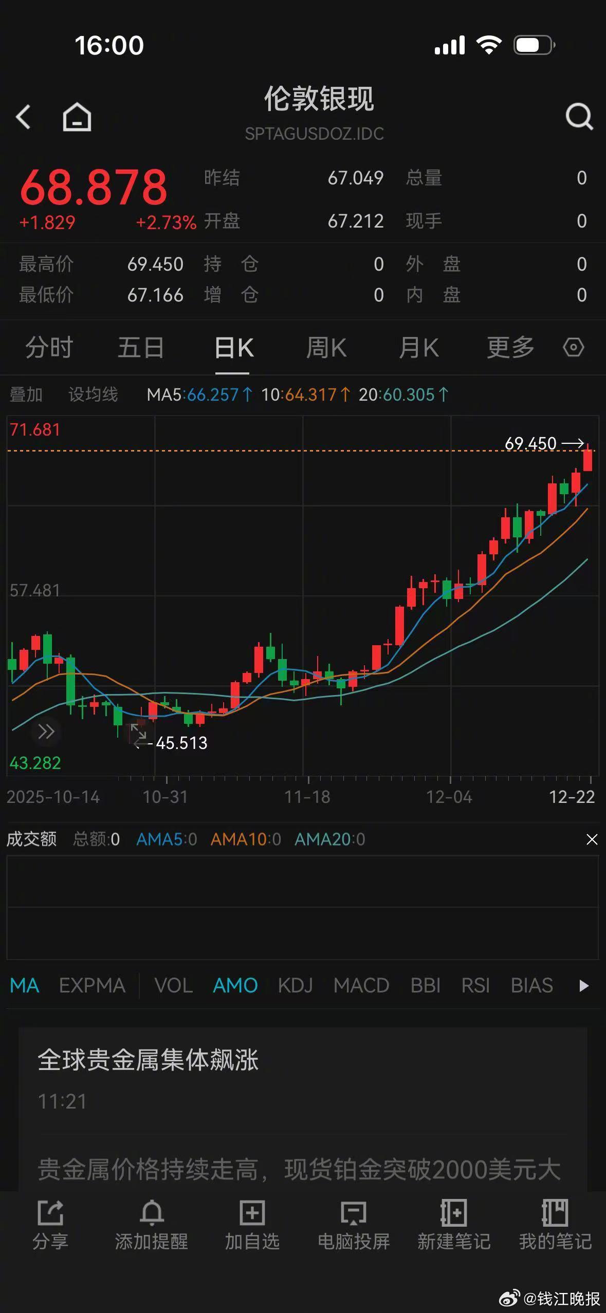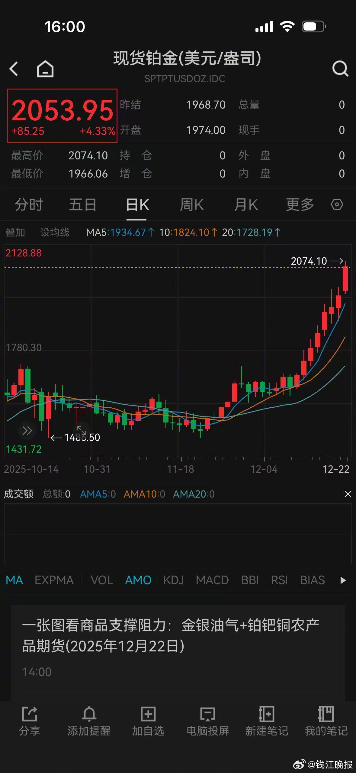 【#贵金属上演疯狂星期一#,#黄金白银铂金齐创历史新高#】12月22日,在降息预期和地缘政治紧张局势等因素推动下,贵金属市场上演疯狂星期一。截至下午4点发稿时,WIND数据显示,现货黄金继续攀升,盘中站上4420美元/盎司,突破10月20日创下的历史纪录(4381.484美元/盎司),再创新高。至此,现货黄金价格年内涨幅超68%。现货白银价格在今天盘中站上69美元/盎司,年内暴涨近140%,再次创下历史新高。此外,在经历了多年沉寂后,铂金以惊人的涨幅重返舞台中央。12月22日,现货铂金盘中最高升至2074.1美元/盎司,创2008年7月下旬以来新高,今年涨幅已超127%。今天A股贵金属板块同样被激活,贵金属指数大涨4.2%,湖南白银、晓程科技等涨超7%,西部黄金、中金黄金、山东黄金等跟涨。光大期货认为,银铂钯依然跟随金价走势,但表现更为强势,黄金持续偏强给了市场做多银铂钯的“底气”,金银比的快速回归也延伸至金铂比和金钯比,为铂钯价格提供有力支撑和推动力,当然在价格快速上行的同时也要防止市场过热下出现快速调整,追高宜谨慎。中信建投金属行业首席王介超认为,黄金、白银、铂钯等贵金属价格大幅飙升,锡、铜、铝等工业金属亦表现强势。一面是充裕的流动性,一面是供给的强约束,推动商品价格不断挑战阶段性高点。另外,基础原材料对经济发展的重要性越来越被相关国家重视,甚至启用关税的手段获得这类产品,加剧了市场的区域性缺口,进一步推动价格的上行。 (潮新闻 记者 吴恩慧)