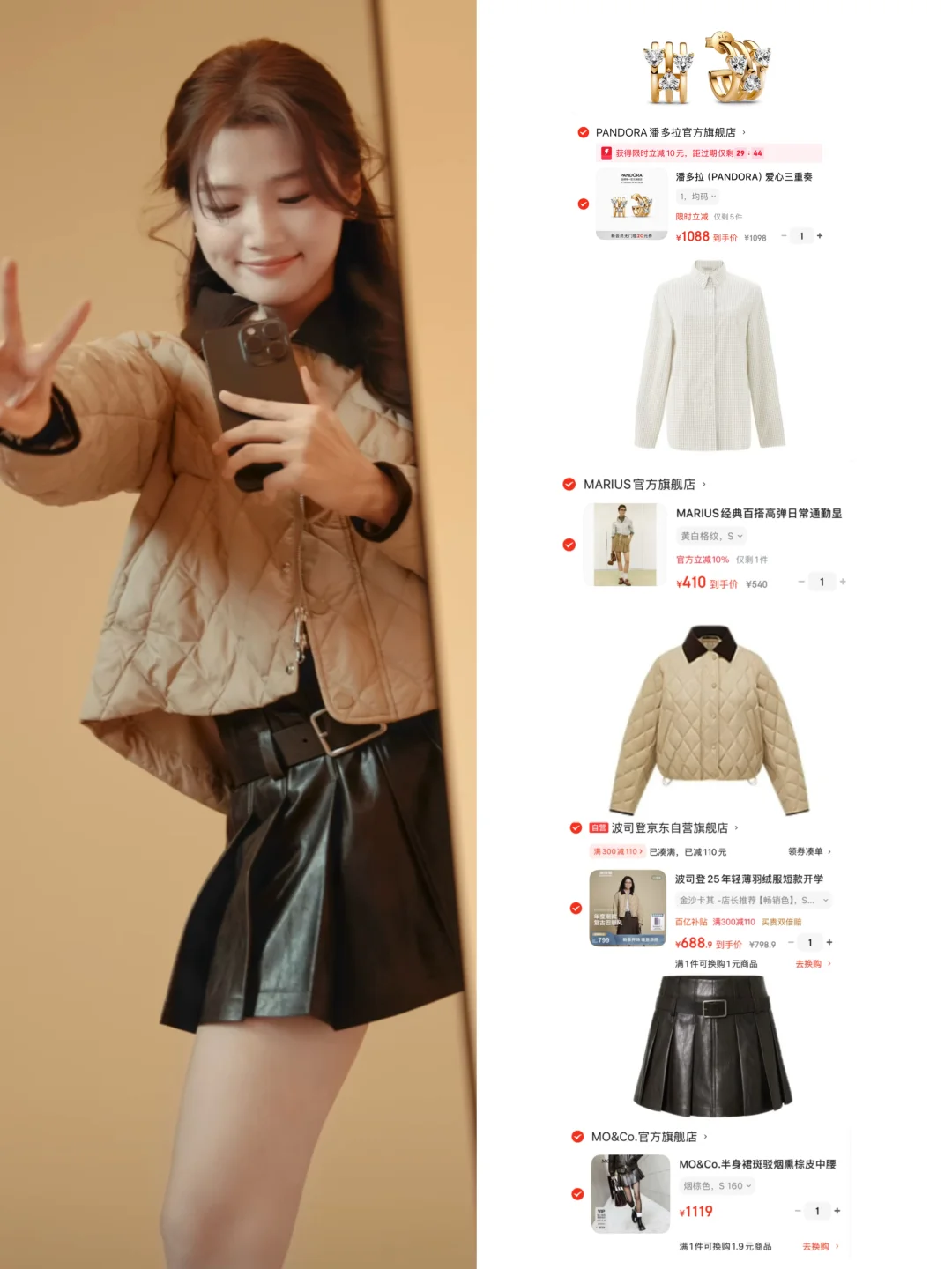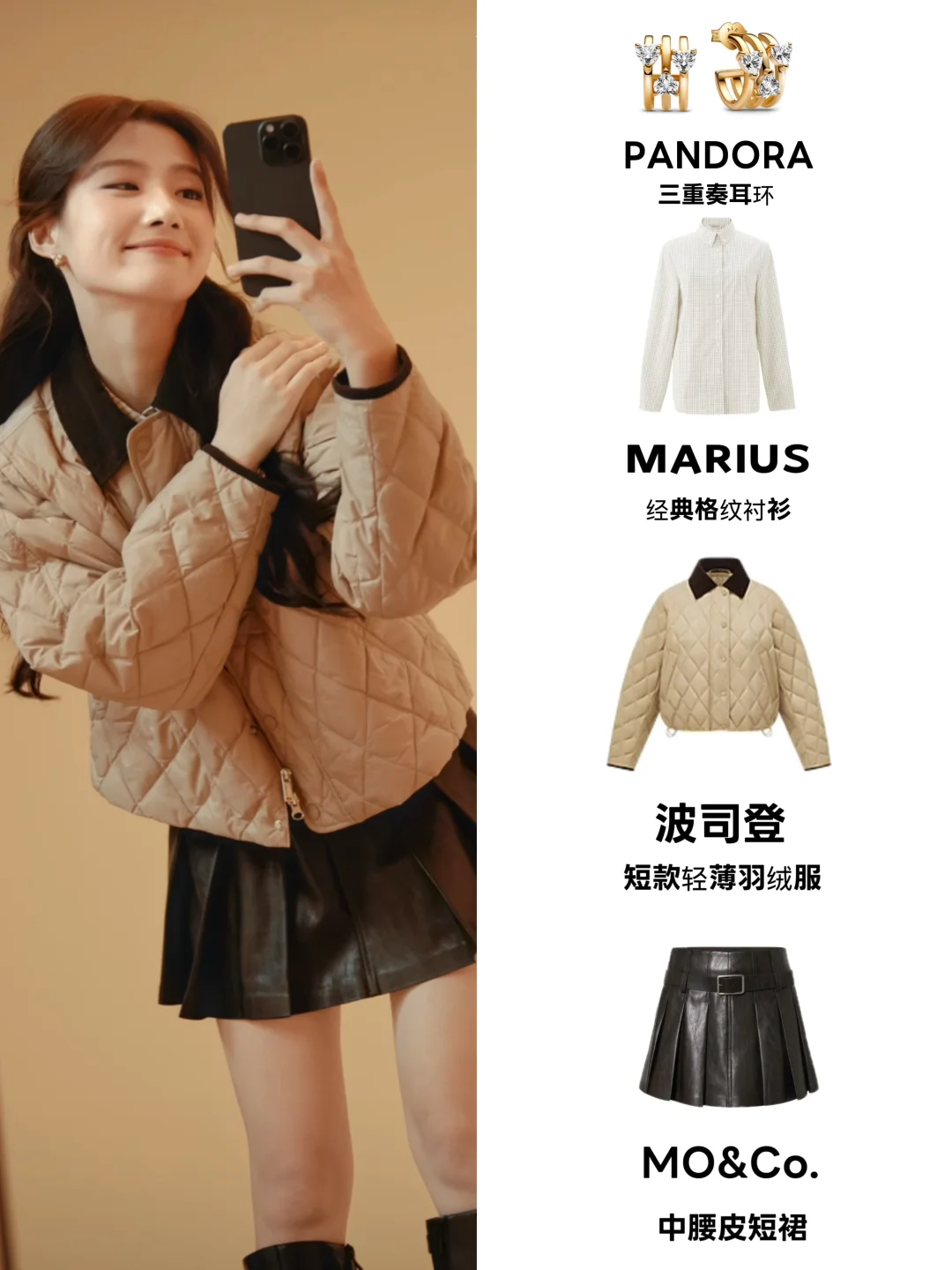 波司登轻薄卡其色羽绒服,面料闪着灵动光芒,高绒子含量的设计轻薄的同时保暖好看,內搭格纹衬衫➕中腰皮短裙,甜酷风直接拿捏❗️普通人可复制粘贴的穿搭模版
