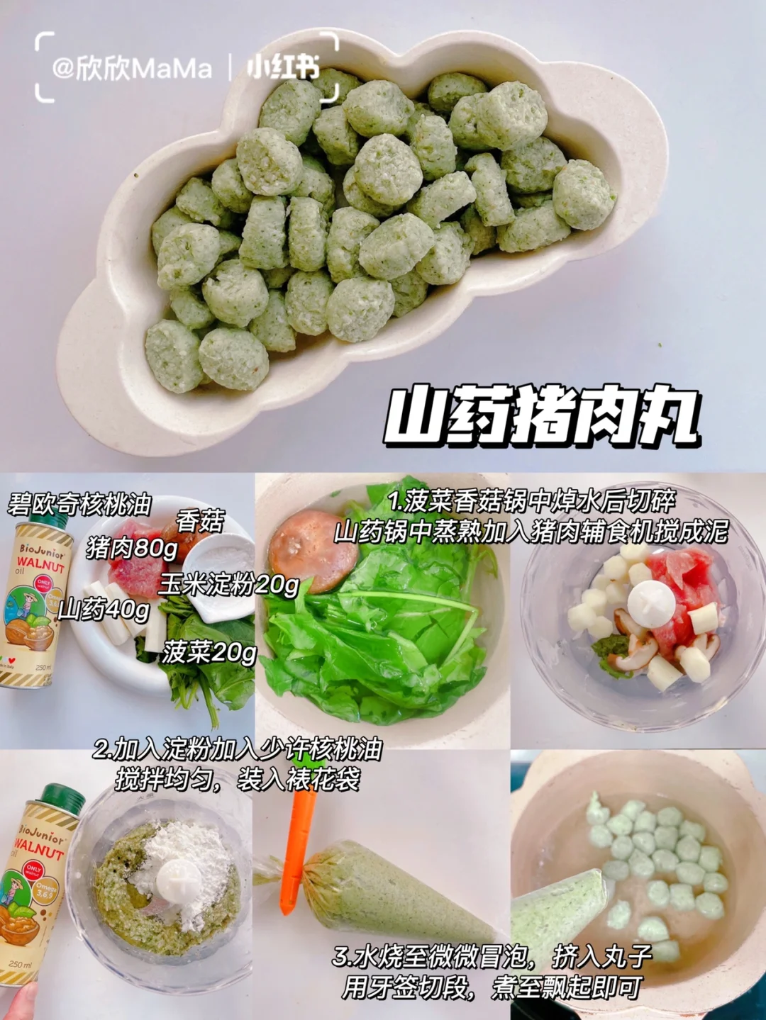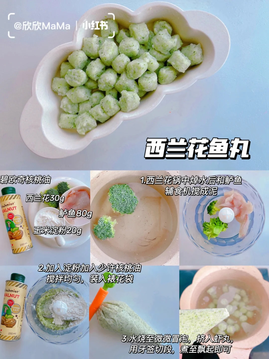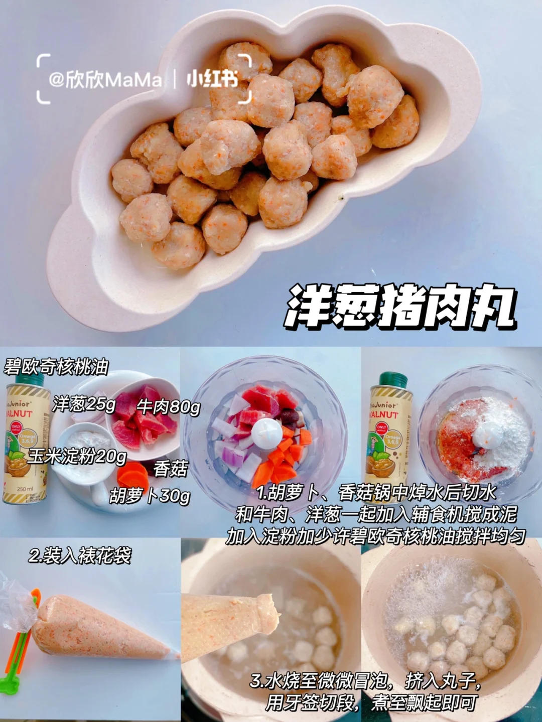 今天分享的这几款迷你小丸子~口感超好~超软糯~入口即化~没牙的宝宝也能吃哦 有菜有肉~营养满满~还可以锻炼宝宝的咀嚼能力哦~妈妈们一定要安排起来 . 🔸碧欧奇核桃油 我用到的辅食油是碧欧奇家的核桃油,它的不饱和脂肪酸高达90%,它油质清澈没有杂质、口感清淡,宝宝更容易接受~而且是金属包装,能很好的储存,保证营养的不流失~平时我都会在宝宝的粥里,面里,肉馅里滴几滴核桃油~宝宝会更爱吃哦~ . 🌈6️⃣种详细做法👀图3~图8 ✅胡萝卜虾丸 🛒食材:碧欧奇核桃油、鲜虾80g、玉米淀粉10g、胡萝卜30g ✅土豆鸡肉丸 🛒食材:碧欧奇核桃油、鸡胸肉80g、胡萝卜20g、玉米淀粉20g、土豆30g、菠菜30g ✅洋葱猪肉丸 🛒食材:碧欧奇核桃油、洋葱25g、牛肉80g、玉米淀粉20g、香菇、胡萝卜30g ✅时蔬土豆丸 🛒食材:碧欧奇核桃油、玉米淀粉20g、蛋黄一个、西兰花20g、胡萝卜20g、土豆80g ✅山药猪肉丸 🛒食材:碧欧奇核桃油、香菇、猪肉80g、玉米淀粉20g、山药40g、菠菜20g ✅西兰花鱼丸 🛒食材:碧欧奇核桃油、西兰花30g、鲈鱼80g、玉米淀粉20g . ⚠️煮丸子一定要中小火,水微微开就行,不能煮开,不然容易煮散 ⚠️加入淀粉那一步可以用辅食机搅打也可以顺时针搅拌上劲 ⚠️煮好的丸子可以密封冷冻保存一周,要吃的时候取适量加热 ⚠️可搭配面条、粥、红烧、也可以烧汤 ⚠️适合8个月以上的宝宝,一岁以上可加少许盐和酱油调味! . 简单又好吃的迷你丸子完成啦 是不是很简单!妈妈们一定要安排上哦~ 有疑问🤔️也可以评论区留言喔😄 💡关注我带您解锁更多辅食制作 宝宝辅食|8月龄宝宝辅食|9月龄宝宝辅食|10月龄宝宝辅食|11月龄宝宝辅食|1岁宝宝辅食|宝宝丸子|宝宝肉丸