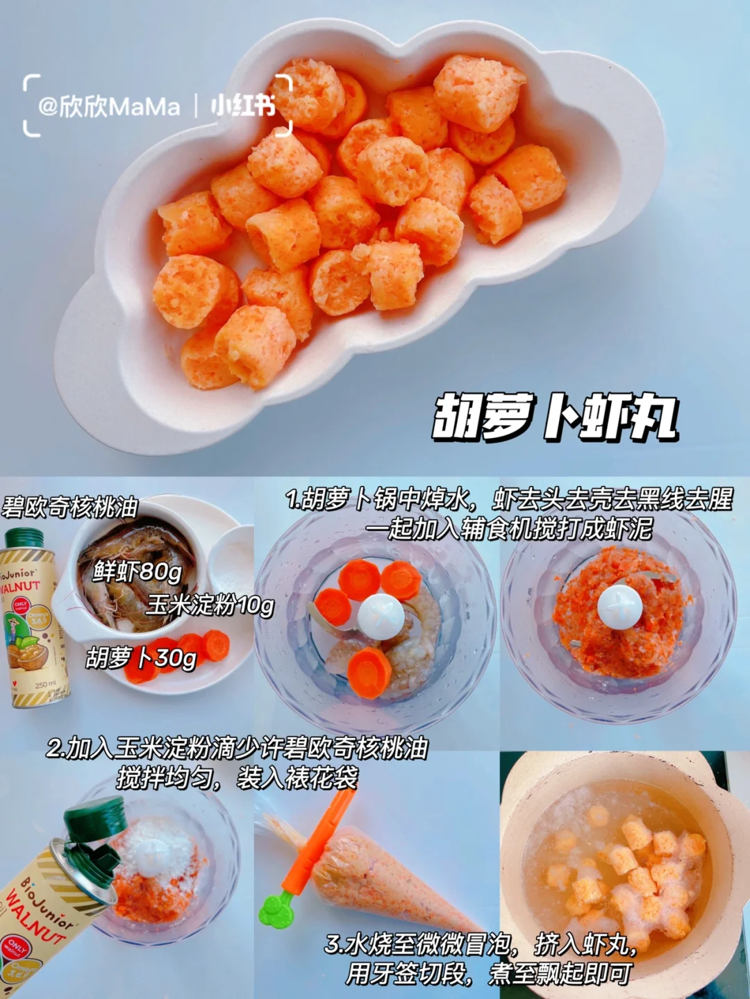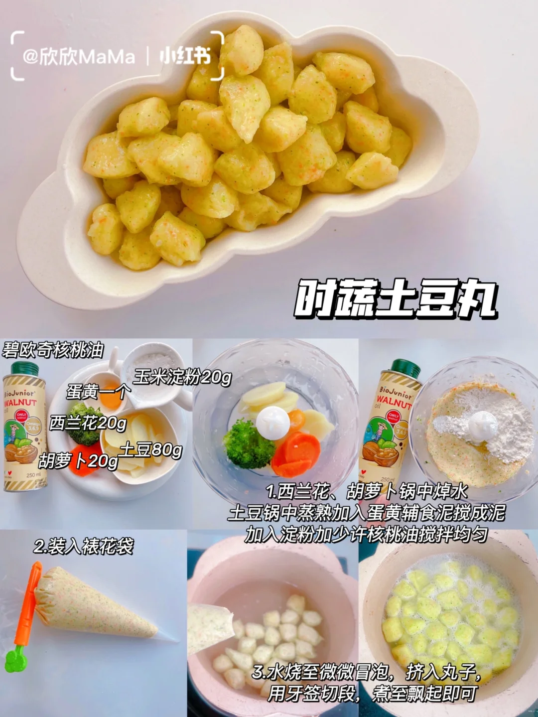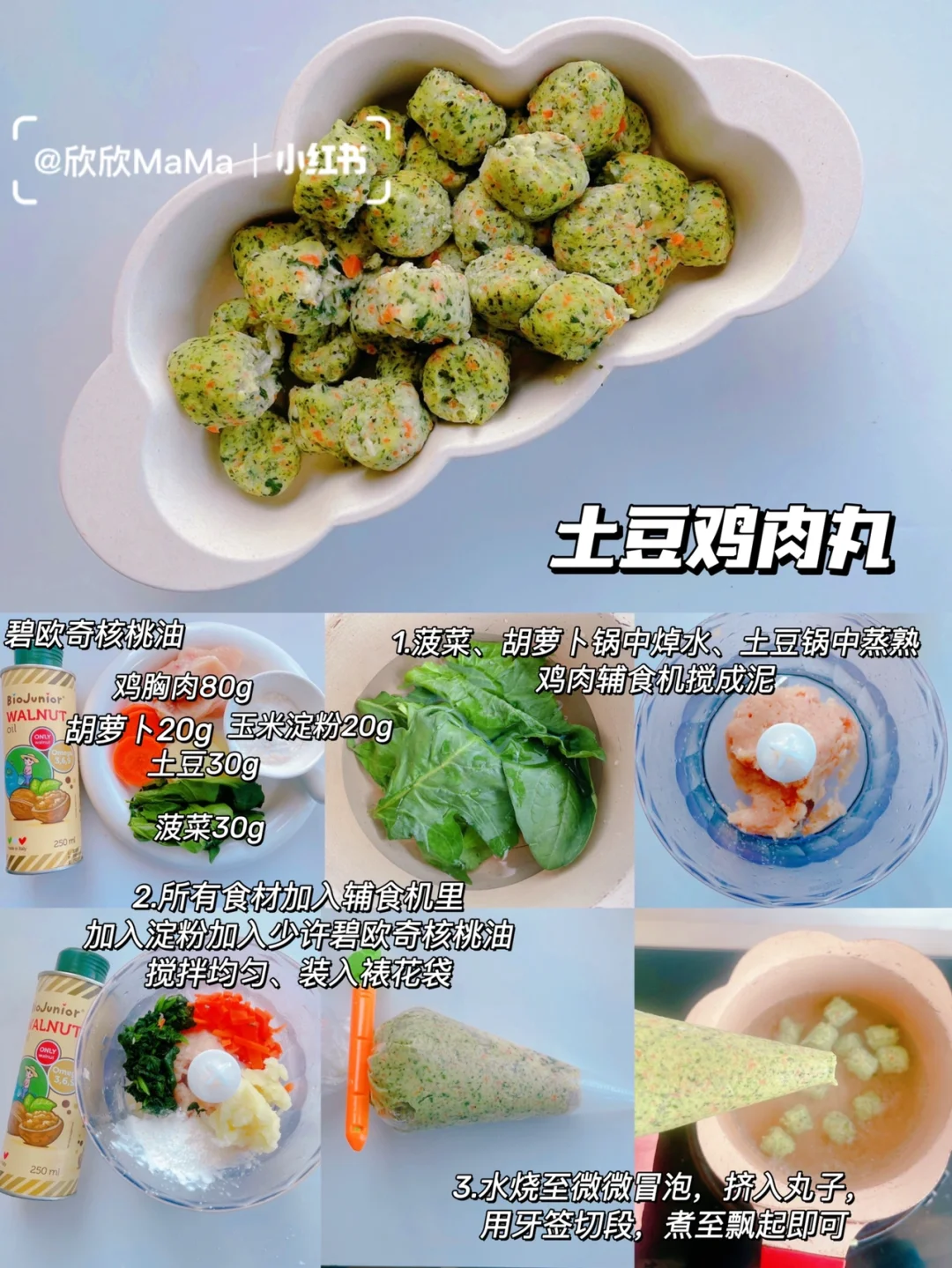 今天分享的这几款迷你小丸子~口感超好~超软糯~入口即化~没牙的宝宝也能吃哦 有菜有肉~营养满满~还可以锻炼宝宝的咀嚼能力哦~妈妈们一定要安排起来 . 🔸碧欧奇核桃油 我用到的辅食油是碧欧奇家的核桃油,它的不饱和脂肪酸高达90%,它油质清澈没有杂质、口感清淡,宝宝更容易接受~而且是金属包装,能很好的储存,保证营养的不流失~平时我都会在宝宝的粥里,面里,肉馅里滴几滴核桃油~宝宝会更爱吃哦~ . 🌈6️⃣种详细做法👀图3~图8 ✅胡萝卜虾丸 🛒食材:碧欧奇核桃油、鲜虾80g、玉米淀粉10g、胡萝卜30g ✅土豆鸡肉丸 🛒食材:碧欧奇核桃油、鸡胸肉80g、胡萝卜20g、玉米淀粉20g、土豆30g、菠菜30g ✅洋葱猪肉丸 🛒食材:碧欧奇核桃油、洋葱25g、牛肉80g、玉米淀粉20g、香菇、胡萝卜30g ✅时蔬土豆丸 🛒食材:碧欧奇核桃油、玉米淀粉20g、蛋黄一个、西兰花20g、胡萝卜20g、土豆80g ✅山药猪肉丸 🛒食材:碧欧奇核桃油、香菇、猪肉80g、玉米淀粉20g、山药40g、菠菜20g ✅西兰花鱼丸 🛒食材:碧欧奇核桃油、西兰花30g、鲈鱼80g、玉米淀粉20g . ⚠️煮丸子一定要中小火,水微微开就行,不能煮开,不然容易煮散 ⚠️加入淀粉那一步可以用辅食机搅打也可以顺时针搅拌上劲 ⚠️煮好的丸子可以密封冷冻保存一周,要吃的时候取适量加热 ⚠️可搭配面条、粥、红烧、也可以烧汤 ⚠️适合8个月以上的宝宝,一岁以上可加少许盐和酱油调味! . 简单又好吃的迷你丸子完成啦 是不是很简单!妈妈们一定要安排上哦~ 有疑问🤔️也可以评论区留言喔😄 💡关注我带您解锁更多辅食制作 宝宝辅食|8月龄宝宝辅食|9月龄宝宝辅食|10月龄宝宝辅食|11月龄宝宝辅食|1岁宝宝辅食|宝宝丸子|宝宝肉丸
