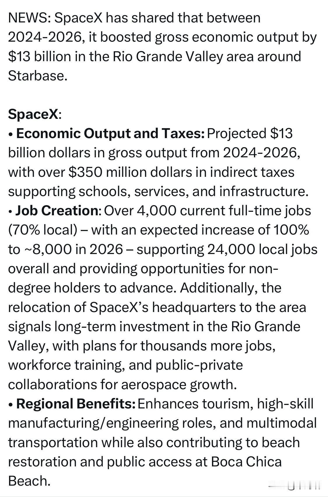 新闻:SpaceX 表示,在 2024 年至 2026 年期间,其在星际基地周围的格兰德河谷地区创造了 130 亿美元的经济产出增长。 格兰德河谷地区(Rio Grande Valley,简称 RGV,当地常称为“The Valley”)主要指美国德克萨斯州最南端的一个区域。 SpaceX: • 经济产出和税收:预计 2024 年至 2026 年总产出为 130 亿美元,其中超过 3.5 亿美元的间接税收用于支持学校、服务和基础设施。 • 创造就业机会:目前已有超过4000个全职工作岗位(70%为本地岗位),预计到2026年将增长100%,达到约8000个,从而支持当地总共24000个就业岗位,并为非学位持有者提供晋升机会。此外,SpaceX总部迁至该地区标志着对格兰德河谷的长期投资,计划创造数千个就业岗位,开展劳动力培训,并促进航空航天领域的公私合作发展。 • 区域效益:促进旅游业、高技能制造/工程岗位和多式联运,同时还有助于博卡奇卡海滩的修复和公众通道。