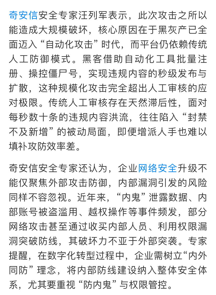 一觉醒来,没有一个热搜话题是关于快手的,这么大的事故,不可能冷处理吧?支付宝、微信崩了,都会上个新闻头条,快手这事还不够大吗?有安全专家分析称,此次规模化攻击已经超出了人工审核的应对极限,即便增派人手也难以填补攻防效率差。这么说其实快手也是受害者,今天股价还跌了。但也有网友表示,为什么偏偏是快手?
