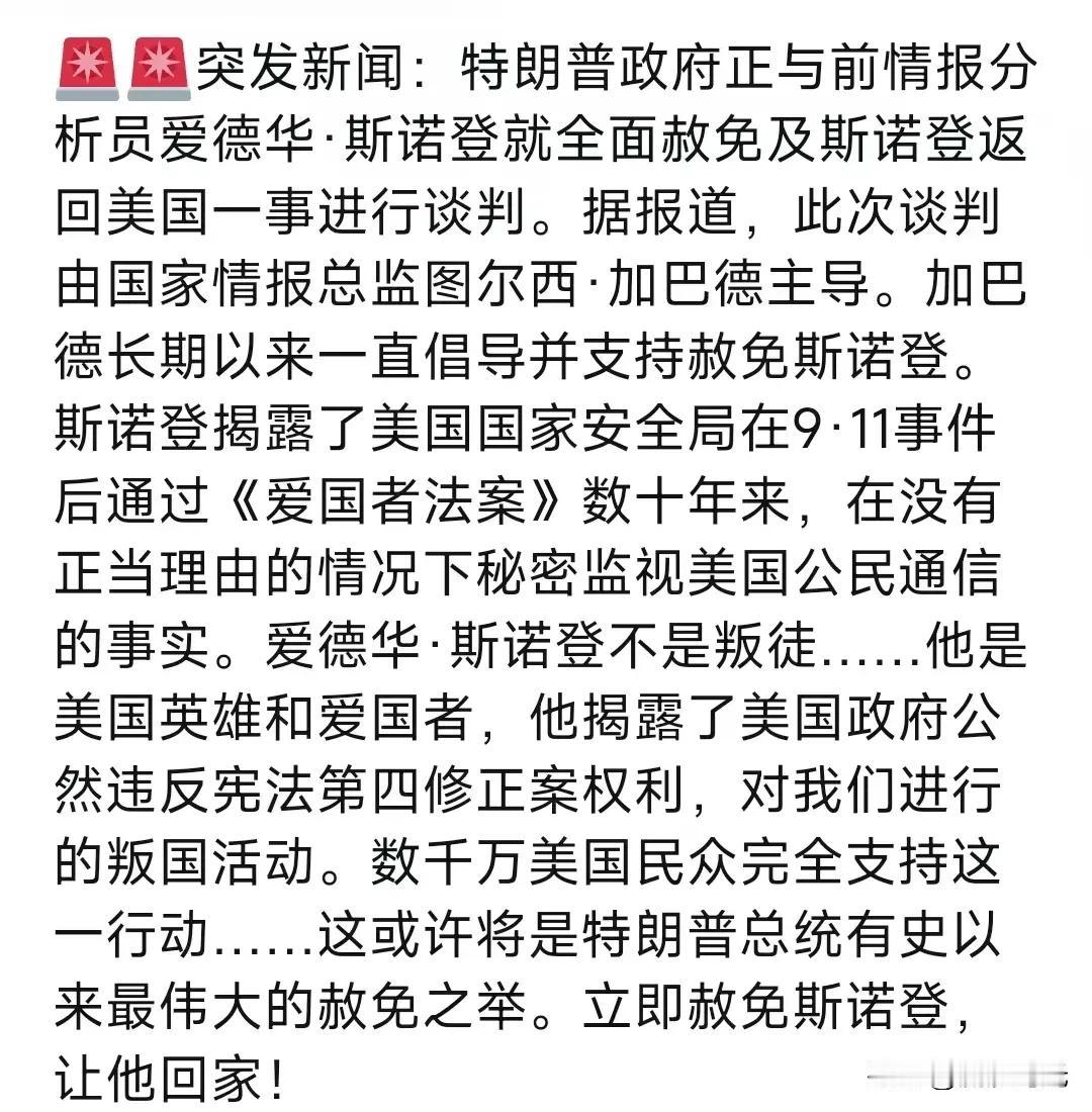 突发:特朗普政府正与前情报分析员爱德华·斯诺登就全面赦免及斯诺登返回美国一事进行谈判。据报道,此次谈判由国家情报总监图尔西·加巴德主导。加巴德长期以来一直倡导并支持赦免斯诺登。斯诺登揭露了美国国家安全局在9·11事件后通过《爱国者法案》数十年来,在没有正当理由的情况下秘密监视美国公民通信的事实。爱德华·斯诺登不是叛徒......他是美国英雄和爱国者,他揭露了美国政府公然违反宪法第四修正案权利,对我们进行的叛国活动。数千万美国民众完全支持这一行动......这或许将是特朗普总统有史以来最伟大的赦免之举。立即赦免斯诺登,让他回家!