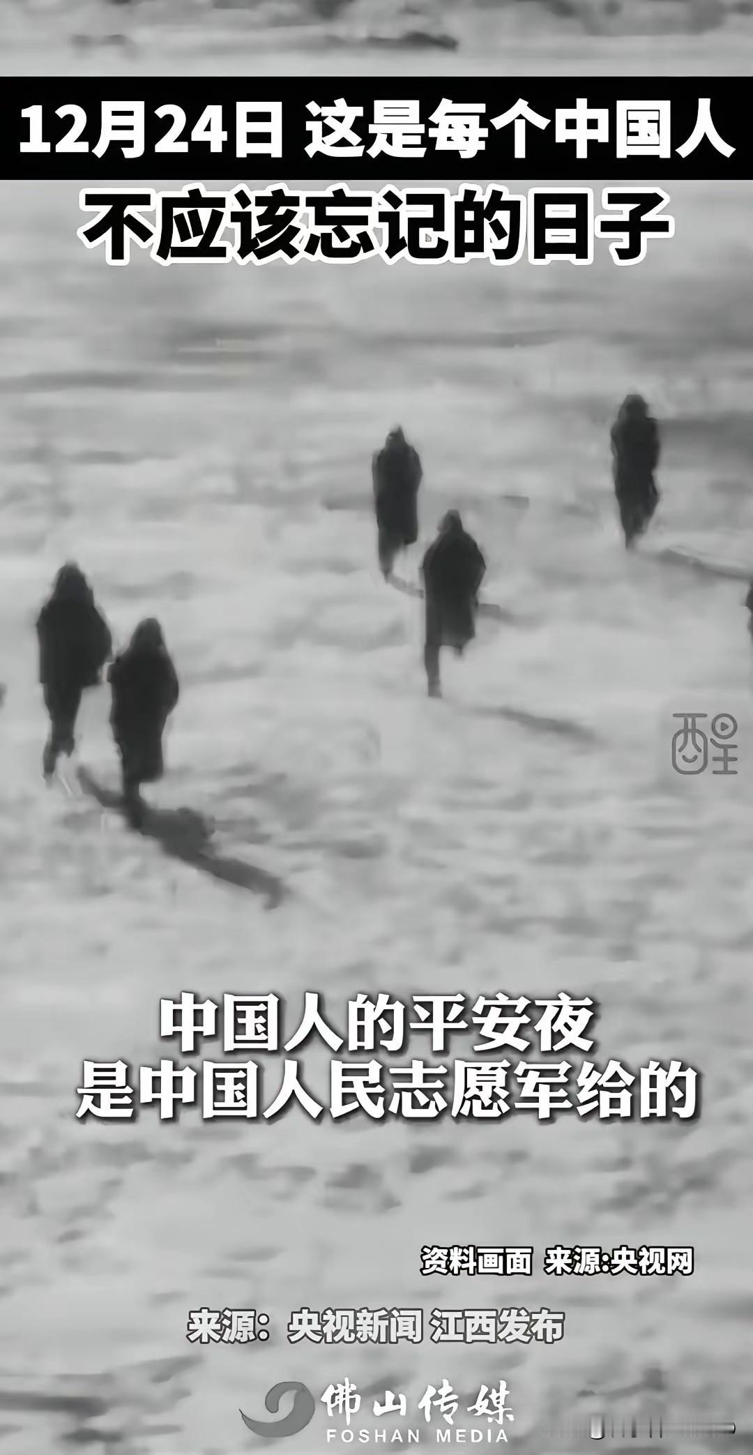 今天是12月24号,日历上清楚的写到,平安夜。中国人的平安夜是千千万万志愿军战士浴血奋战换来的,我们现在的幸福生活,是老一辈革命家打下的基础上发展起来的!吃水不忘挖井人,不忘初心,方得始终!希望每个人都能牢记这段历史,做好自己!