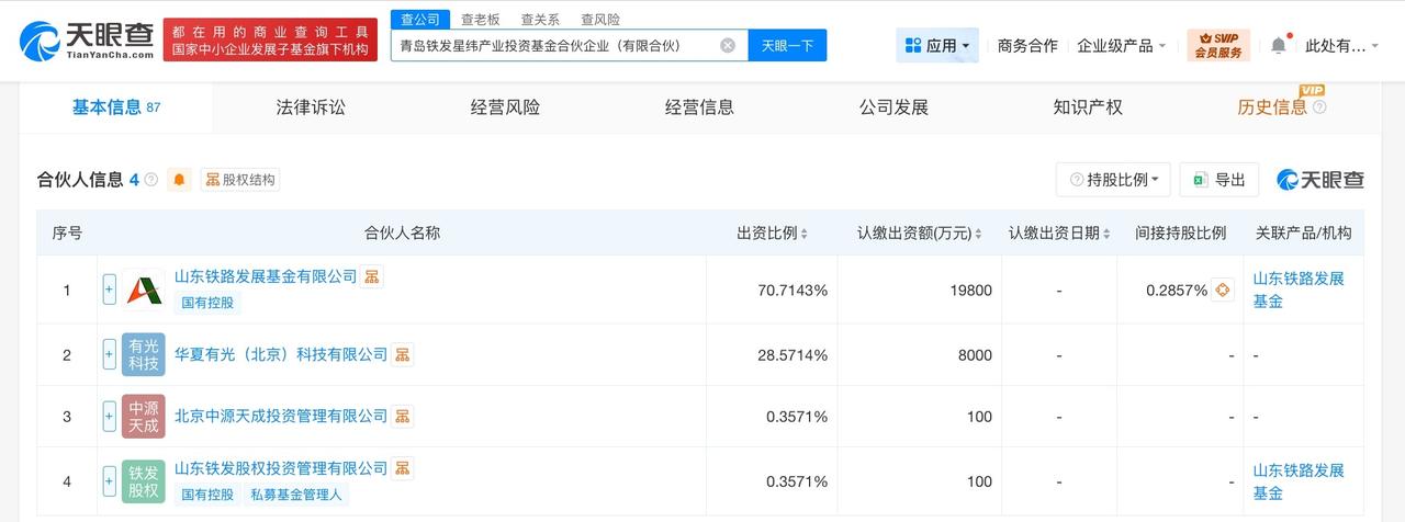 山东铁路发展基金等在青岛成立新基金出资额2.8亿 天眼查App显示,近日,青岛铁发星纬产业投资基金合伙企业(有限合伙)成立,执行事务合伙人为山东铁发股权投资管理有限公司、北京中源天成投资管理有限公司,出资额2.8亿人民币,经营范围为以私募基金从事股权投资、投资管理、资产管理等活动。合伙人信息显示,该基金由山东铁路发展基金有限公司、华夏有光(北京)科技有限公司、北京中源天成投资管理有限公司、山东铁发股权投资管理有限公司共同出资。 天眼查信息: