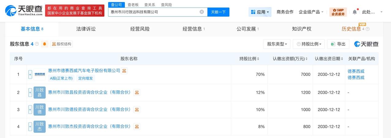 德赛西威等成立川行致远科技公司注册资本1亿 天眼查App显示,近日,惠州市川行致远科技有限公司成立,法定代表人为陈俊峰,注册资本1亿人民币,经营范围含人工智能应用软件开发、人工智能理论与算法软件开发、人工智能硬件销售、人工智能行业应用系统集成服务、物联网技术服务、物联网设备制造、工业机器人制造、工业机器人销售、智能机器人的研发、新能源汽车整车销售等,由德赛西威、惠州市川致昌投资咨询合伙企业(有限合伙)、惠州市川致德投资咨询合伙企业(有限合伙)、惠州市川致杰投资咨询合伙企业(有限合伙)共同持股。 天眼查信息: