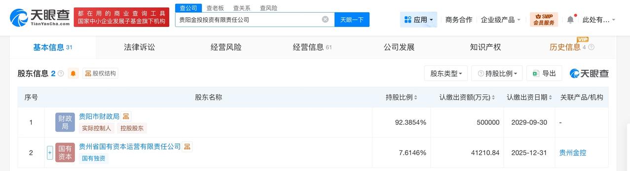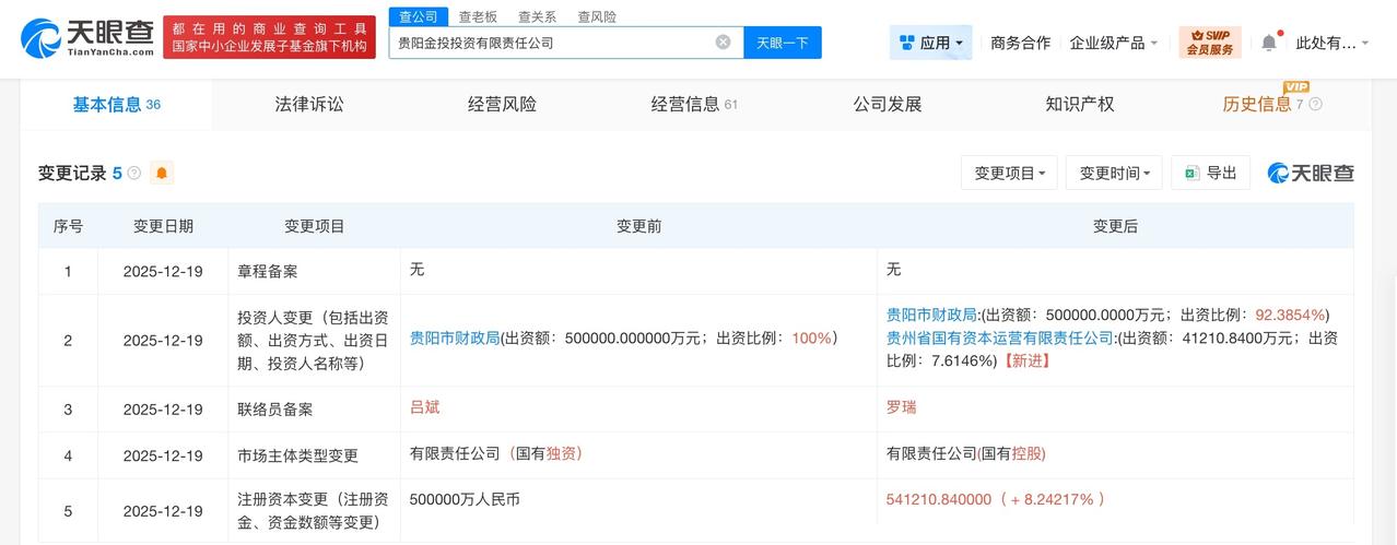 贵阳金投投资公司增资至54.1亿增幅约8% 天眼查App显示,近日,贵阳金投投资有限责任公司发生工商变更,注册资本由50亿人民币增至约54.1亿人民币,增幅约8%。 该公司成立于2024年9月,法定代表人为韩芝磊,经营范围为以自有资金从事投资活动、社会经济咨询服务,由贵阳市财政局、贵州省国有资本运营有限责任公司共同持股。 天眼查信息: