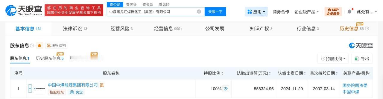中煤黑龙江煤炭化工集团增资至55.8亿增幅约6% 天眼查App显示,近日,中煤黑龙江煤炭化工(集团)有限公司发生工商变更,注册资本由约52.8亿人民币增至约55.8亿人民币,增幅约6%。 该公司成立于2001年12月,法定代表人为冯占军,经营范围含煤炭及制品销售、煤炭洗选、化工产品生产、金属废料和碎屑加工处理、水泥制品制造、化工产品销售、金属制品销售、机械设备销售等,由中国中煤能源集团有限公司全资持股。 天眼查信息: