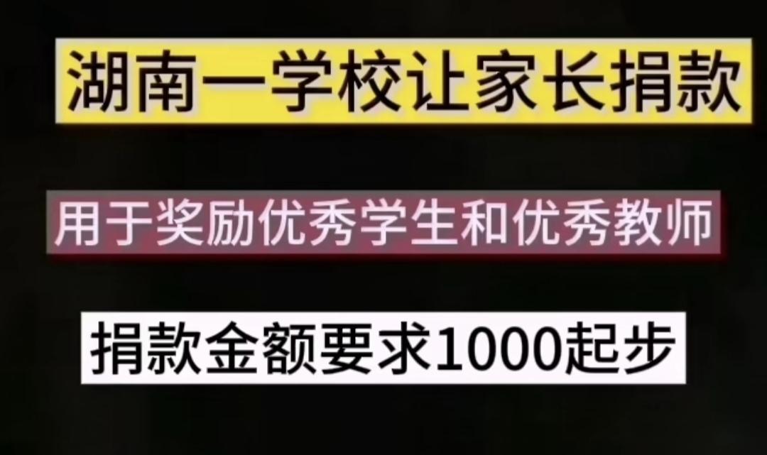 学校让家长捐款奖励优秀学生和优秀教师?嫌捐款太少,要求起步金额1000元?看到这样的新闻,我简直觉得匪夷所思。这明显严重违规而且耻辱的行为,是怎么制定和推行的?学校的领导们都认为合适吗?没有人提出反对意见,没有人考虑到这种事情带来的严重后果?这可是网络自媒体时代呀,也许校长太自信了,认为家长都会觉得老师很辛苦,捐多少钱都愿意。 这也是对教师这个职业的一种侮辱,这是强行募捐,也相当于乞讨。有网友说,这可能是家委会的一部分家长的意思,我说就算家长有这样的意思,学校可以拒绝呀。只要校领导有正常的三观,就不会做这种事情。我觉得拿这种钱,真的内心会感到羞愧的,都没有勇气和胆量面对学生。