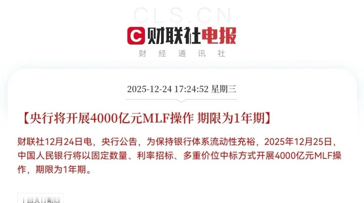 央妈加码大利好!明日有望继续收中大阳线了下午5点24分,央妈又来利好了,央行公告,为保持银行体系流动性充裕,央行将开展4000亿元MLF操作,期限为期1年!大利好,这是大利好消息!虽迟但到,央妈给力,继续准时为资本市场添砖加瓦,央妈开展MLF操作将有三大利好,第一有利于银行体系,缓解银行流动性压力,增强银行的放贷能力和意愿,第二有利于实体经济,将推动企业综合融资成本稳中有降,支持企业投资和生产经营,第三有利于资本市场,有助于提升市场风险偏好和增强持股信心,总而言之,央妈总是能出现在关键时点,为A股创造迎难而上的条件,必须给央妈点赞!股民们!坐稳扶好!受央妈利好消息,预计明日能点燃市场情绪,高开高走!预计要起飞!稳了!