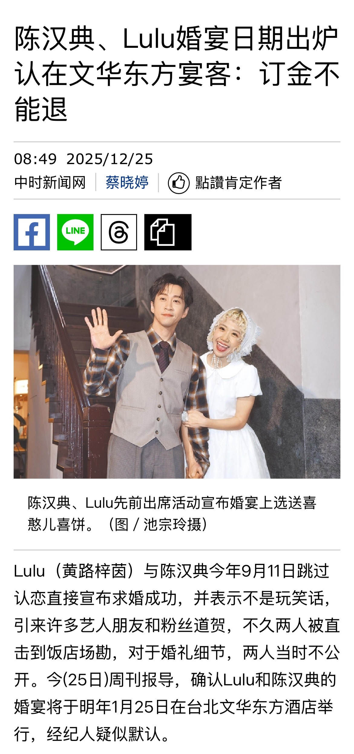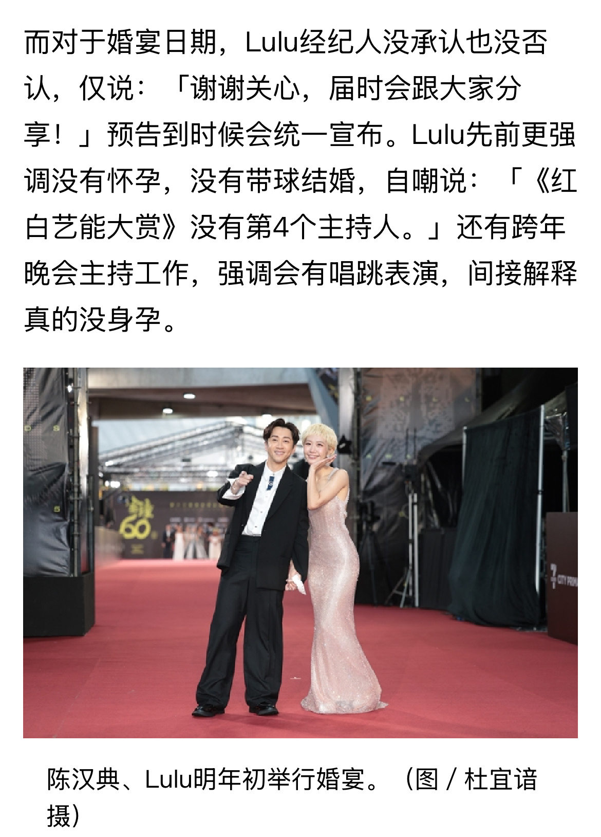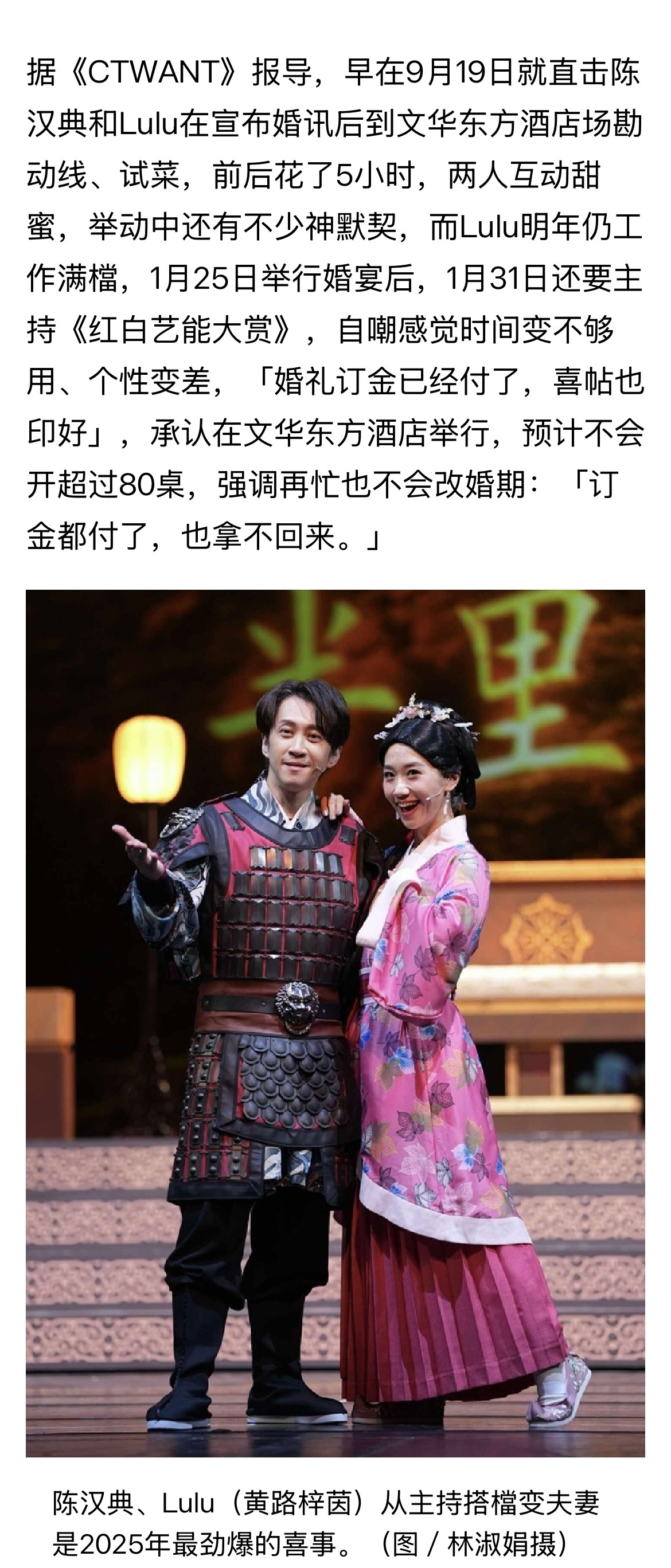陈汉典Lulu将于明年1月15日举行婚宴陈汉典Lulu婚宴将1月25日举办