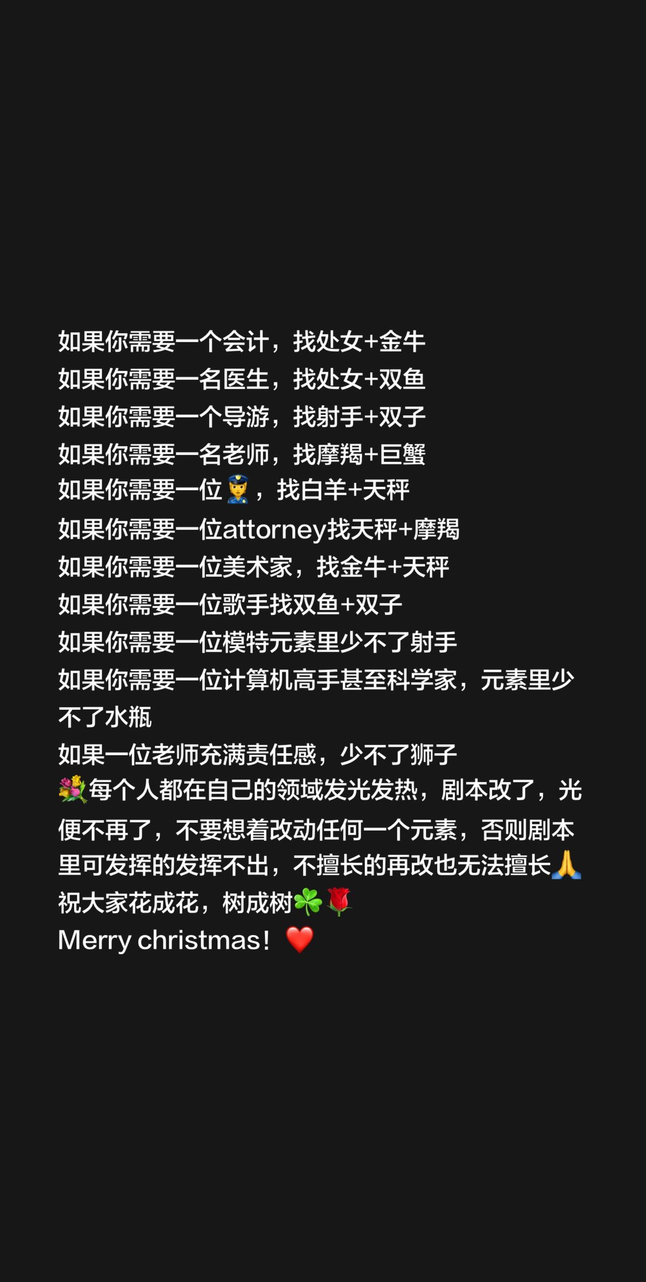 可以改剧本吗?如果你需要一个会计,找处女+金牛 如果你需要一名医生,找处女+双鱼 如果你需要一个导游,找射手+双子 如果你需要一名老师,找摩羯+巨蟹 如果你需要一位👮,找白羊+天秤 如果你需要一位attorney找天秤+摩羯 如果你需要一位美术家,找金牛+天秤 如果你需要一位歌手找双鱼+双子 如果你需要一位模特元素里少不了射手 如果你需要一位计算机高手甚至科学家,元素里少不了水瓶 如果一位老师充满责任感,少不了狮子 💐每个人都在自己的领域发光发热,剧本改了,光便不再了,不要想着改动任何一个元素,否则剧本里可发挥的发挥不出,不擅长的再改也无法擅长🙏 祝大家花成花,树成树☘️🌹 Merry christmas!❤️