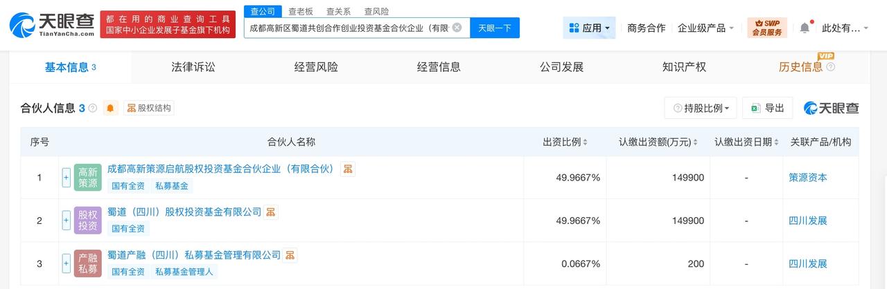 成都高新区蜀道共创合作创业投资基金成立出资额30亿 天眼查App显示,近日,成都高新区蜀道共创合作创业投资基金合伙企业(有限合伙)成立,执行事务合伙人为蜀道产融(四川)私募基金管理有限公司,出资额30亿人民币,经营范围为创业投资。合伙人信息显示,该基金由成都高新策源启航股权投资基金合伙企业(有限合伙)、蜀道(四川)股权投资基金有限公司、蜀道产融(四川)私募基金管理有限公司共同出资。 天眼查信息: