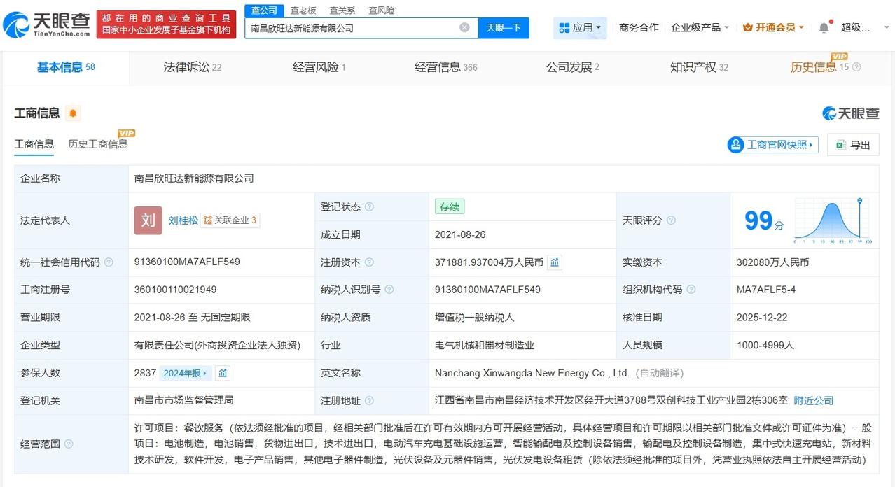 欣旺达南昌新能源公司增资至37亿增幅约23% 天眼查App显示,近日,南昌欣旺达新能源有限公司发生工商变更,注册资本由约30亿人民币增至约37亿人民币,增幅约23%。 该公司成立于2021年8月,法定代表人为刘桂松,经营范围包括电池制造、电池销售、软件开发、电子产品销售等。股东信息显示,该公司由欣旺达动力科技股份有限公司全资持股。 天眼查信息: