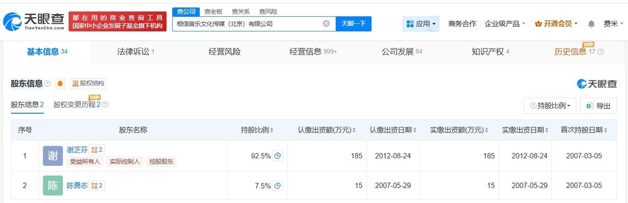 揭秘五月天被举报逃税关联公司 相信音乐大陆公司商业版图盘点朱孝天举报五月天所属公司 近日,艺人朱孝天在粉丝群中称,已举报五月天所属经纪公司“相信音乐”,涉嫌多项违规行为,包括勾结黄牛炒票、通过跨境贸易公司转移资金逃税、强制艺人假唱,甚至牵涉立场问题。 天眼查App显示,相信音乐文化传媒(北京)有限公司成立于2007年3月,法定代表人为谢芝芬,注册资本200万人民币,经营范围包括组织文化艺术交流活动、文艺创作、其他文化艺术经纪代理等,由谢芝芬、陈勇志共同持股。对外投资信息显示,该公司全资持股相信音乐文化传播(上海)有限公司,后者成立于2011年5月,法定代表人为罗辉映,注册资本50万人民币,经营范围包括企业形象策划、文化艺术交流策划、公关活动组织策划等。 值得一提的是,谢芝芬名下还关联进宝中(北京)贸易有限公司,该公司成立于2009年12月,法定代表人为陈勇志,注册资本50万人民币,经营范围包括货物进出口、技术进出口、国内货物运输代理等,由谢芝芬、陈勇志共同持股。 天眼查信息: