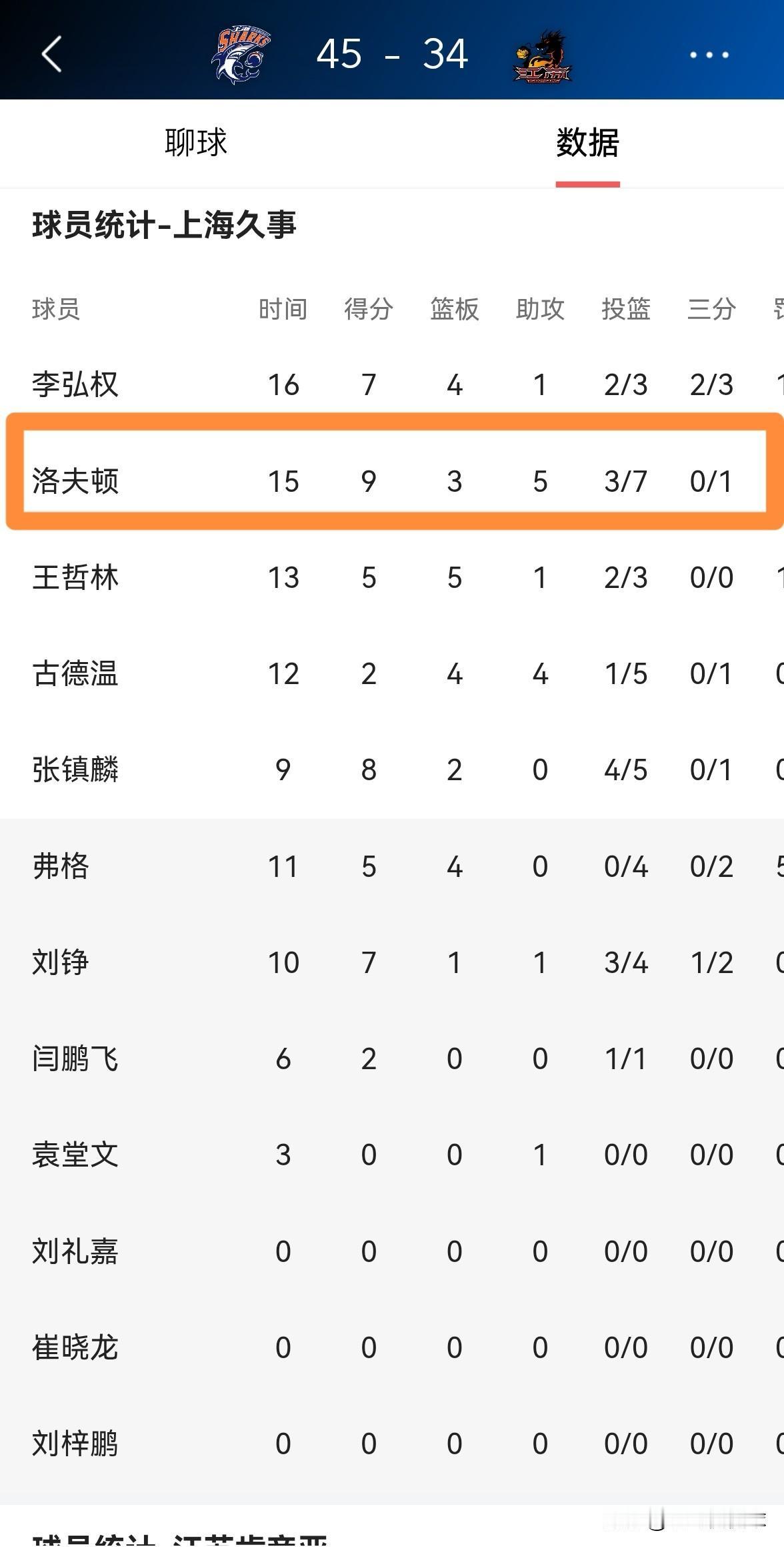 上海久事超级外援洛夫顿真是太全面了!在今天进行的上海久事和江苏肯帝亚的比赛中,目前双方的上半场比赛已经结束,上海久事以45:34领先对手。在前两节比赛中,洛夫顿将自己的全面性展现的淋漓尽致,他在首发出战的15分钟里,投篮7中3,其中三分球1中0、罚球4中3得到9分3篮板5助攻,他的场上正负值为+11。