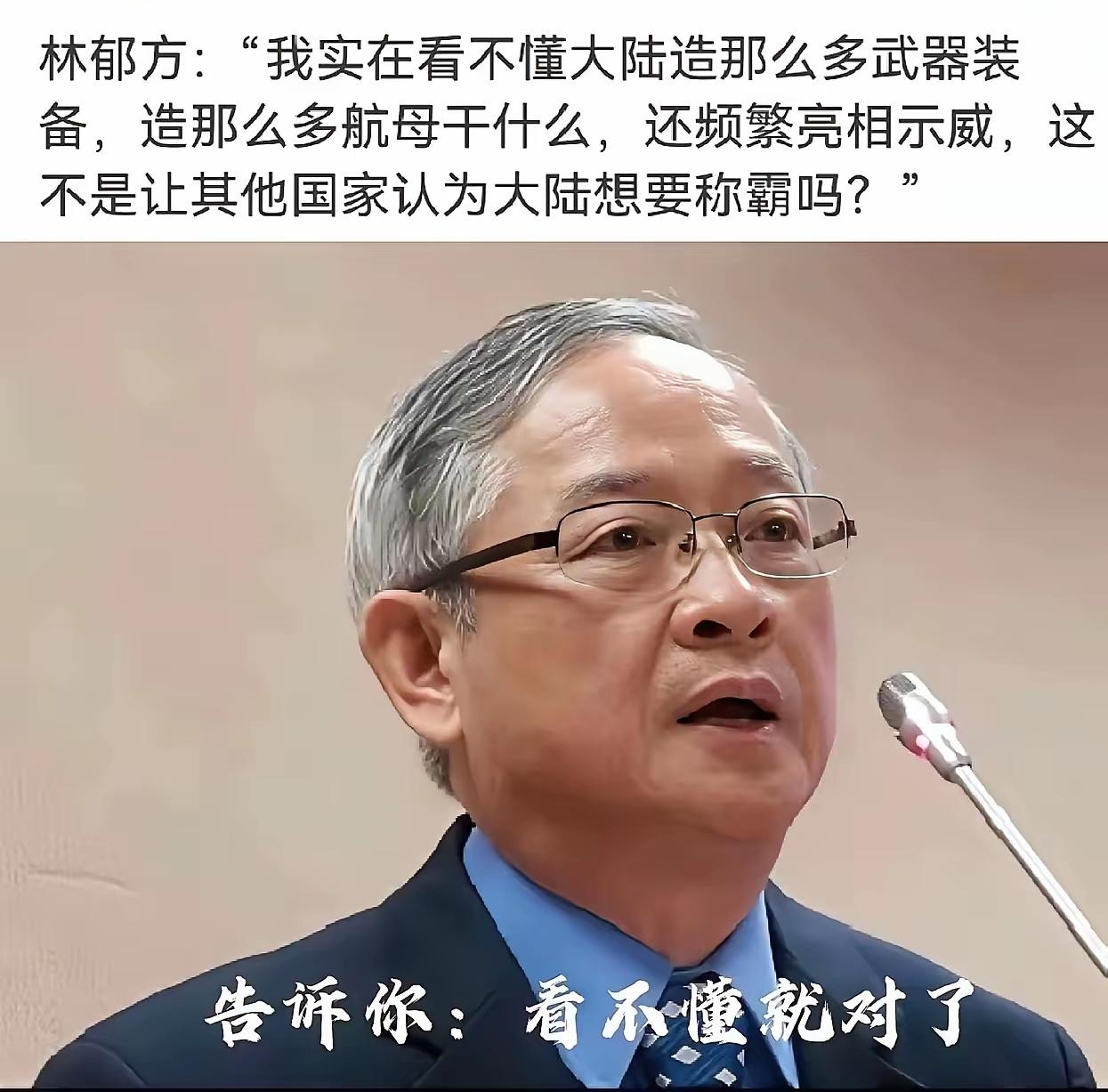 这个林郁方有点傻!要不就是坏! 他说:“我实在看不懂大陆造那么多武器装备,造那么多航母干什么,还频繁亮相示威,这不是让其他国家认为大陆想要称霸吗”。 清朝赔了多少,安全了吗?二百年来在共产党领导下,有点起色了,傻瓜们又来胡说八道了!近有恶邻,远有恶霸,军费总比赔款强,称霸总比被屠杀好,百年耻辱,中国称霸也不会欺负其他国家,是和平世界。 先掰扯掰扯清朝那笔笔烂账,就知道说“赔款换安全”的论调有多荒唐。甲午中日战争打输了,《马关条约》赔出去2亿两白银,加上赎辽费3000万两,这笔钱相当于清朝三年的财政收入。那会儿老百姓的日子过得啥样?河南山东闹饥荒,灾民啃树皮吃观音土,官府还要横征暴敛凑赔款;江南的纺织作坊倒闭一大片,手工业者流离失所,列强拿着这些银子更新武器装备,转头就掀起瓜分中国的狂潮。庚子国难之后的《辛丑条约》更狠,4.5亿两白银的赔款分39年还清,连本带利要付9.8亿两,这笔钱压得整个民族喘不过气,东北被沙俄占着,华北成了列强的势力范围,租界里的洋人耀武扬威,中国人连走路都要绕着走。你说赔了这么多,清朝安全了吗?溥仪最后还不是被人从皇宫里赶出来,偌大的王朝说垮就垮,那些鼓吹赔款求太平的人,早被钉在历史的耻辱柱上了。 再说说这个林郁方,他不是不懂历史,就是揣着明白装糊涂。这位常年混迹政坛的人物,张口闭口喊着“削减军费保和平”,却对周边的局势视而不见。东边的邻国不断突破军事底线,修改安保文件,把军舰开到我们的家门口耀武扬威;远在大洋彼岸的霸权国家,动辄就搞所谓的“航行自由”行动,拉着盟友在亚太地区搞军演,把刀架到了我们的脖子上。这种时候谈削减军费,不是傻是什么?难不成要我们再回到百年前那种任人宰割的日子?他只字不提列强靠坚船利炮掠夺财富的过往,只盯着我们的国防建设说三道四,这种人要么是被利益蒙蔽了双眼,要么就是别有用心,想让中国放弃反抗的底气。 老一辈人嘴里的那些日子,我们可不能忘。有个老红军,他总说自己小时候跟着父母逃荒,一路上看到的全是饿死的难民和被洋人欺负的百姓。后来他参了军,跟着队伍南征北战,就是为了让后代不再受那种苦。新中国成立之后,我们勒紧裤腰带搞国防,造出原子弹氢弹,才有了几十年的和平发展环境。这些年在党的领导下,我们的日子越过越好,高铁通到了偏远山区,老百姓的饭碗端得稳稳的,年轻人能在宽敞的教室里读书,这些成果哪一样离得开强大的国防做后盾?军费花的每一分钱,都是在守护我们的家园,守护我们来之不易的幸福生活,这笔账怎么算都比赔款划算。 那些说中国“称霸”的人,纯粹是睁着眼睛说瞎话。这些年中国派出去的维和部队,在非洲的战乱地区修路架桥,保护当地百姓的安全;亚丁湾护航编队,护送了数千艘中外商船,让海盗不敢轻易作乱;我们提出的一带一路倡议,帮助沿线国家搞建设,让更多人过上了好日子。这些实实在在的行动摆在眼前,哪一点像称霸的样子?我们说的和平世界,是各国平等相待,不再有侵略和掠夺,不再有战火和饥荒,这种和平不是靠赔款换来的,是靠强大的实力守护来的。 百年前的耻辱刻在每个中国人的骨子里,我们知道落后就要挨打,知道和平需要实力来捍卫。现在的中国已经不是百年前的中国了,我们有能力保护自己,有能力维护地区和平。那些还想着让我们放弃国防的人,醒醒吧,历史不会重演,中国也绝不会再任人宰割。各位读者你们怎么看?欢迎在评论区讨论。