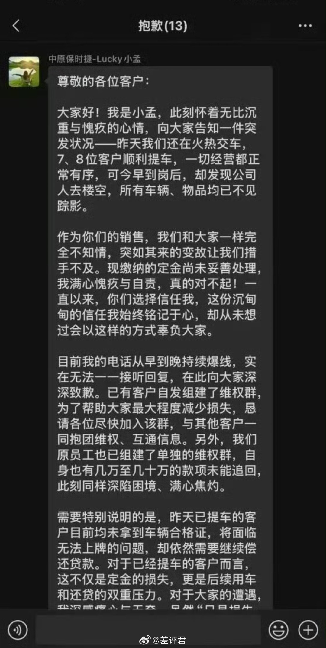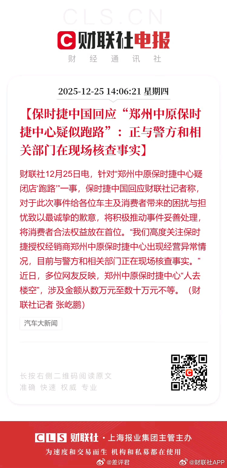 #差评说车# 这两年经销商跑路见多了,各种合资车、BBA经销商跑路屡见不鲜,但保时捷跑路的好像还真不多。一来保时捷4S店只在一二线城市有,而且数量也不会太多,能承接不少当地甚至外地的维保生意;二是卖保时捷自身利润空间本来就足。对于这次经销商跑路,保时捷中国官方应该会协调介入。相关部门其实也应该加强对汽车经销商这类重资产经营单位的监管,比如按照流水缴纳一定比例的保证金,不然这种事咱消费者遇见了,真就一点招也没有的。