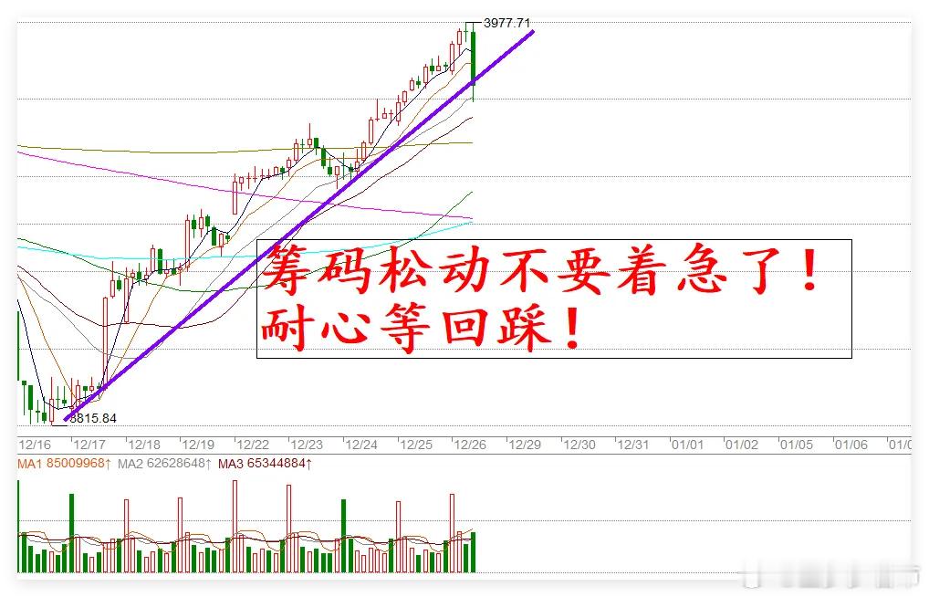12.26日午评:大变脸,近4000股下跌,下周A股怎么看? A股要止步8连阳了,我特别想知道,上午有没冲动而入场的朋友!是不是想找个豆腐撞上去!那么接下来怎么看? 1.大趋势我依然看好,震荡向上,长线不用管!虽然可能波动比较大! 2.今天筹码松动了,虽然下周还可能冲高,操作难度也大! 3.我们大部分人还需要等真的回踩出现,且调整到位! 4.预计调整幅度不太小,大家一定要耐心!