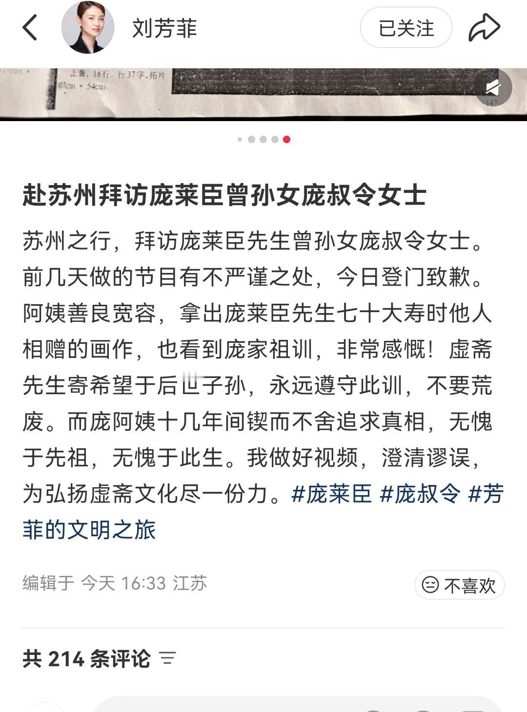 12月26日,刘芳菲抵达苏州,见到了庞莱臣曾孙女庞叔令女士,并就12月22日晚上的直播节目,向真正的庞莱臣后人庞叔令进行当面道歉。 刘芳菲老师这次去苏州打扮的依旧精致,穿着灰色大衣和白色裤子,戴着绿色围脖,衣着得体。与庞叔令女士坐在家里的沙发上热聊,并进行合影,在柜子里摆放着庞莱臣先生的遗像,看到了庞叔令女士家里珍藏的有关庞莱臣先生的画作和庞家祖训。 刘芳菲老师处理问题还是特别的真诚,第一时间到苏州进行登门道歉,用行动表达了自己的态度。