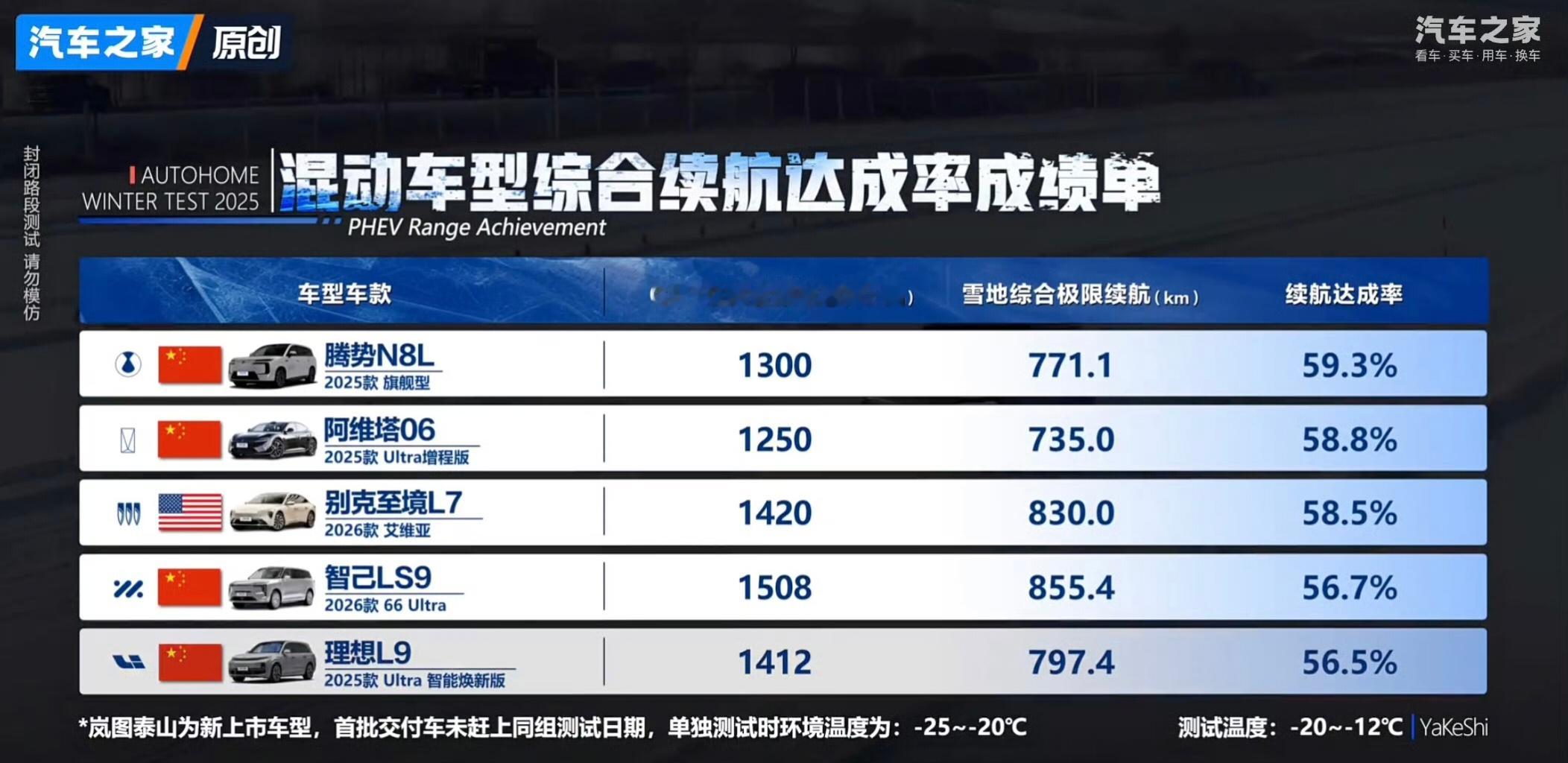 看了汽车之家冬测,感觉在极寒地区用混动还是好很多,CLTC续航都标1000+,实测下来达成率都能超过50%,真的很好了,也就是至少都有500+,我反正是非常满意了
