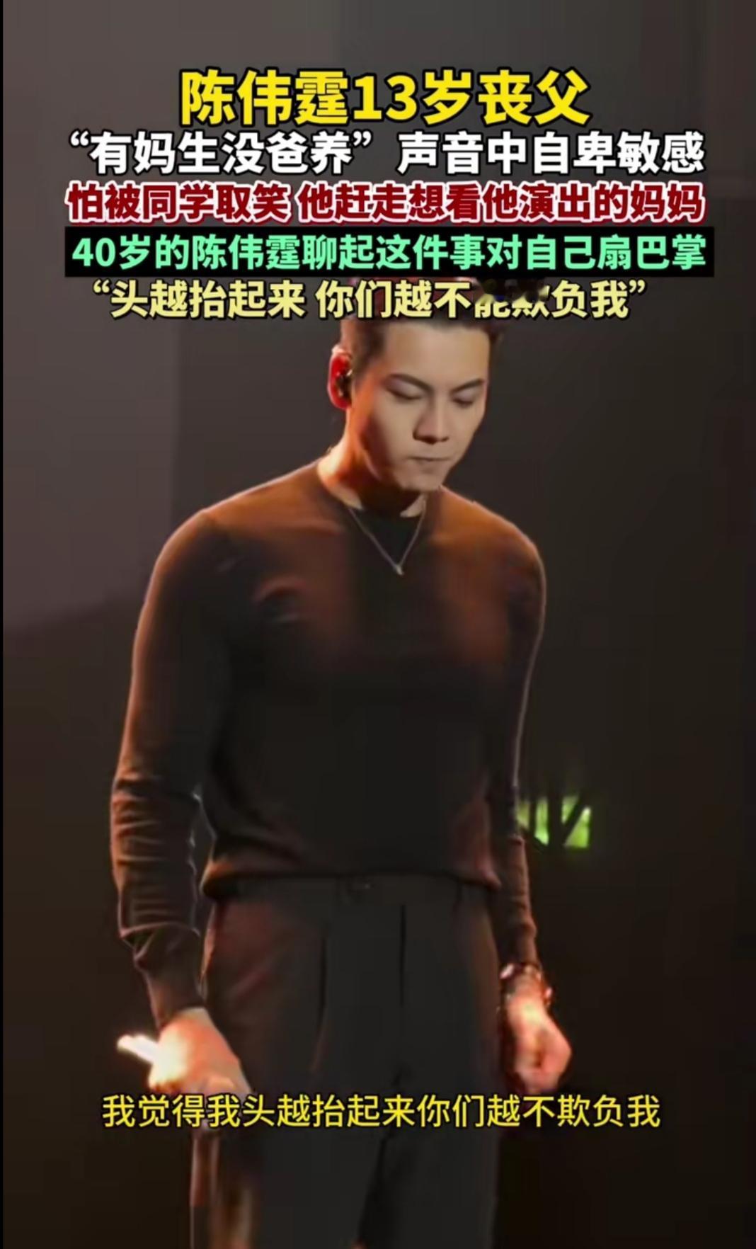 刷到陈伟霆聊13岁丧父的专访,最让人心疼的不是被同学说“有妈生没爸养”,而是他亲口说赶走了想来校看他演出的妈妈。时隔二十多年,40岁的他提起这事还会对自己扇巴掌,这份愧疚,怕是刻进骨子里了。 那时的他被自卑裹住,怕同学看到孤身的妈妈,再拿父亲的事嘲讽自己,便狠心地把最亲近的人推远。他以为这样能护住自己的体面,却没意识到,妈妈只是想看着舞台上的儿子,哪怕只是远远一眼。少年的倔强像一把钝刀,既扎了自己,也伤了最爱他的人。 如今他成了即将当爸爸的人,或许更能体会到母亲当年的心情——那份想靠近、想守护,却被孩子推开的无奈与心疼。原来成长最残忍的一课,是我们总要在长大后,才懂年少时对亲人的伤害,要用一辈子去愧疚和弥补。