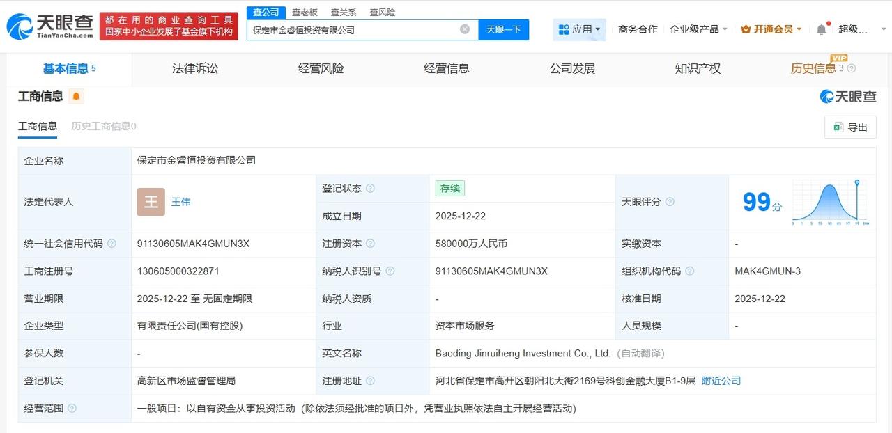 保定国资58亿成立金睿恒投资公司 天眼查工商信息显示,近日,保定市金睿恒投资有限公司成立,法定代表人为王伟,注册资本58亿人民币,经营范围为以自有资金从事投资活动。股东信息显示,该公司由保定市国有资产经营管理有限公司、保定市华科房地产开发有限公司共同持股。 天眼查信息: