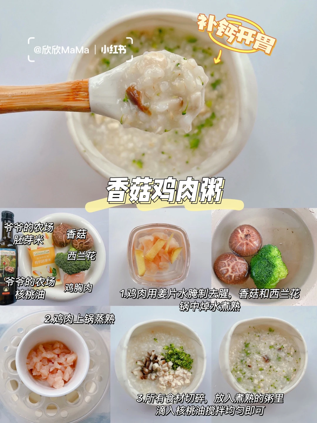 🛒食材:爷爷的农场有机胚芽米、爷爷的农场核桃油、香菇、鸡胸肉、西兰花