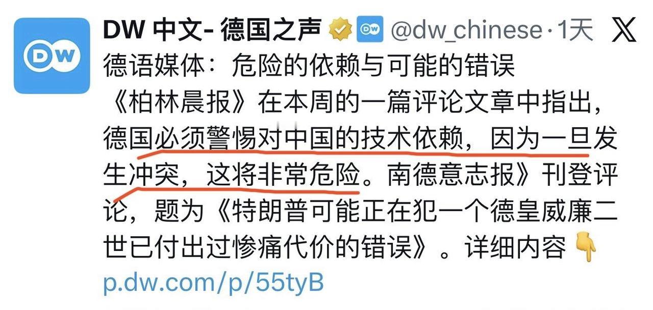 中国存在几千年了,除了德国人参加八国联军入侵过中国,强占过胶州湾之外,中国从未伤害过他们,甚至还支持过两德统一,可他们说对中国的技术依赖“将非常危险”。反之,美国人两次摧毁他们、肢解他们,至今还在他们国土上驻军几万人,还窃听他们的总理和高官,可他们认为应该依赖美国人。我把这种基于意识形态的思维模式称为“意识形态的蠢货”。