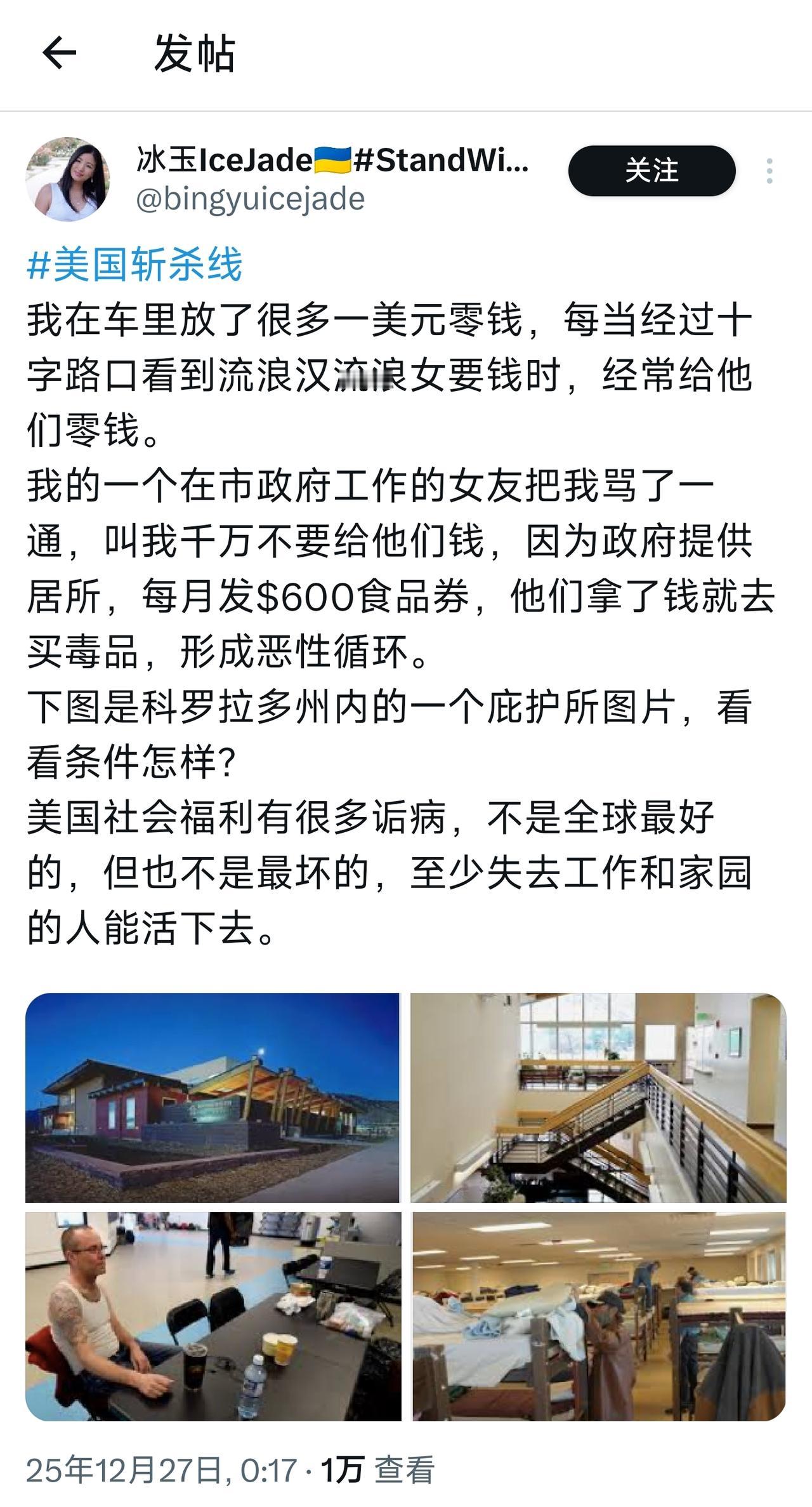 我在车里放了很多一美元零钱,每当经过十字路口看到流浪汉流浪女要钱时,经常给他们零钱。 我的一个在市政府工作的女友把我骂了一通,叫我千万不要给他们钱,因为政府提供居所,每月发$600食品券,他们拿了钱就去买毒品,形成恶性循环。 下图是科罗拉多州内的一个庇护所图片,看看条件怎样? 美国社会福利有很多诟病,不是全球最好的,但也不是最坏的,至少失去工作和家园的人能活下去。