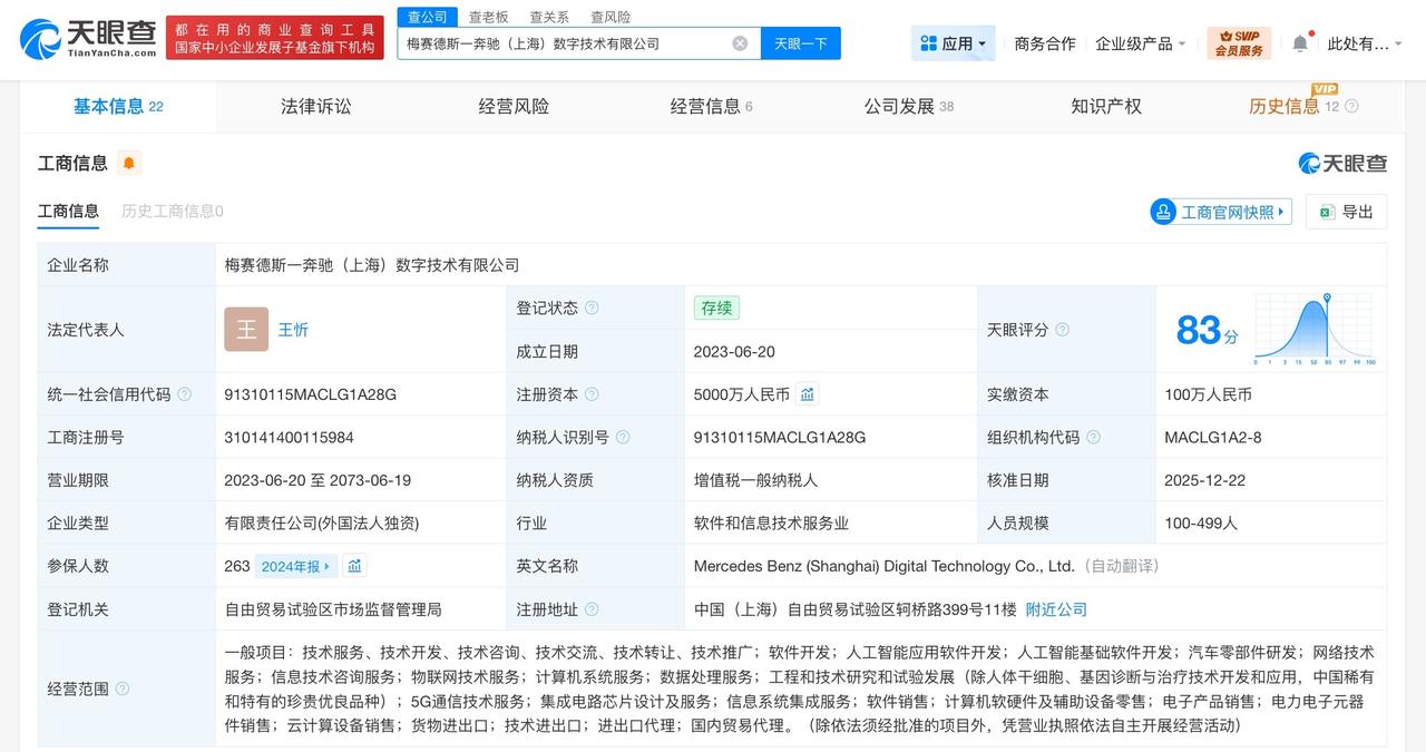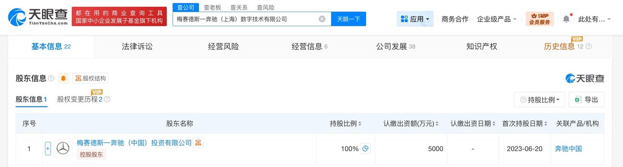 奔驰旗下数字技术公司增资至5000万增幅4900% 天眼查工商信息显示,近日,梅赛德斯一奔驰(上海)数字技术有限公司发生工商变更,注册资本由100万人民币增至5000万人民币,增幅4900%,同时,部分高管也发生变更。 该公司成立于2023年6月,法定代表人为王忻,经营范围含软件开发、人工智能应用软件开发、人工智能基础软件开发、汽车零部件研发、网络技术服务、信息技术咨询服务、物联网技术服务、数据处理服务等。股东信息显示,该公司由梅赛德斯一奔驰(中国)投资有限公司全资持股。 天眼查信息:
