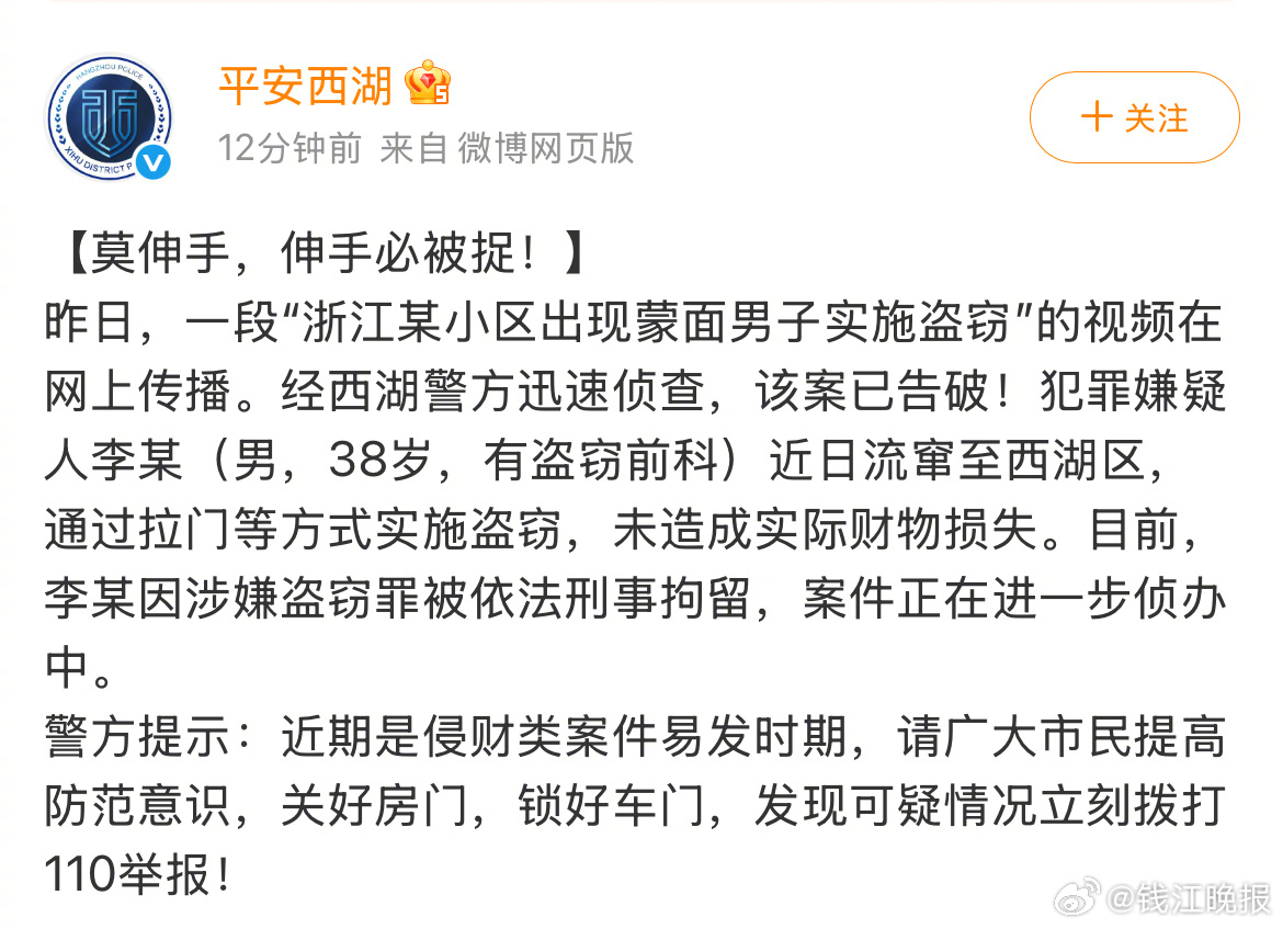 【 #流窜盗窃的蒙面男子已落网# 未造成实际财物损失 】12月26日,一段“浙江某小区出现蒙面男子实施盗窃”的视频在网上传播。经西湖警方迅速侦查,该案已告破!犯罪嫌疑人李某(男,38岁,有盗窃前科)近日流窜至西湖区,通过拉门等方式实施盗窃,未造成实际财物损失。目前,李某因涉嫌盗窃罪被依法刑事拘留,案件正在进一步侦办中。警方提示:近期是侵财类案件易发时期,请广大市民提高防范意识,关好房门,锁好车门,发现可疑情况立刻拨打110举报!(潮新闻 记者 谢春晖)