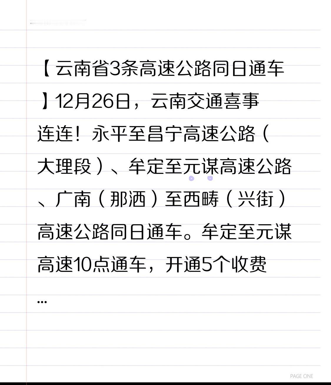 【云南省3条高速公路同日通车】 12月26日,云南交通喜事连连!永平至昌宁高速公路(大理段)、牟定至元谋高速公路、广南(那洒)至西畴(兴街)高速公路同日通车。 牟定至元谋高速10点通车,开通5个收费站,牟定到元谋车程缩至半小时,客车和货车有不同收费标准。广南(那洒)至西畴(兴街)高速横跨文山3县,计费里程58.477公里,桥隧比超6成。它打通滇东南交通脉络,完善路网结构,还能串联沿线资源。这三条高速通车,以后出行更方便,沿线产业发展也会迎来新机遇! 云南高速路况 云南高速公路 基建狂魔 高速公路