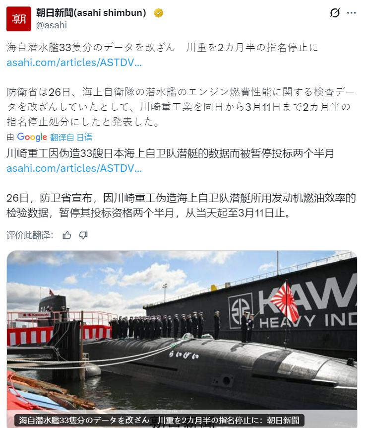 日本军工造假30年! 日本川崎重工替海上自卫队潜艇制造引擎,早前被揭存在篡改燃耗性能数据丑闻。防卫省以长期系统性违规行为,自周四(26日)起,暂停该公司投标资格两个半月。 根据调查,川崎重工业由1988年至2021年长期篡改潜艇引擎燃料性能数据,借此达到防卫省要求基准值,涉及多达33艘,66台发动机。