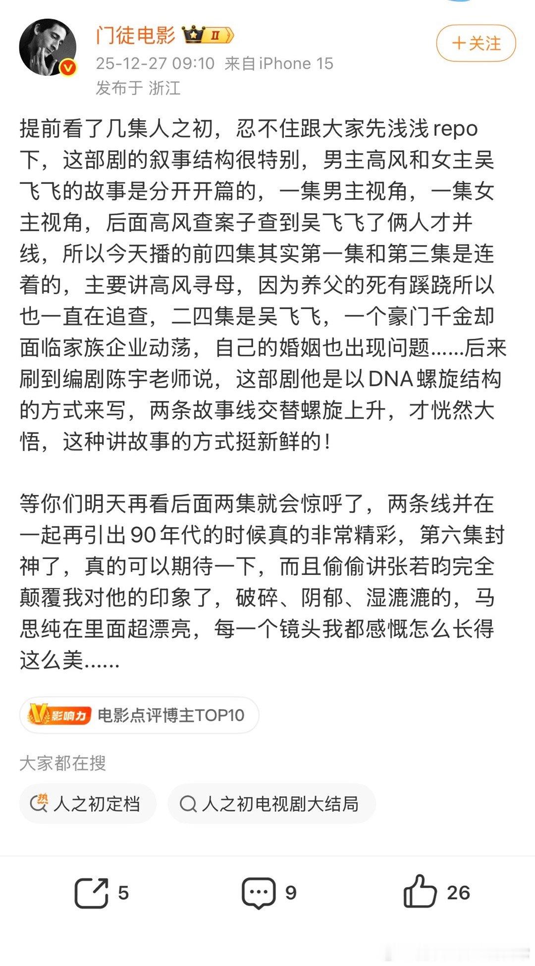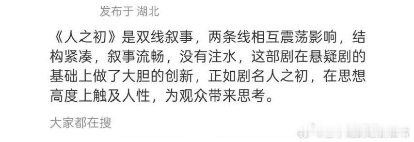 人之初大胆结构人之初叙事结构很独特人之初的叙事结构真的好独特,男主女主旧时空三线并行,这结构简直够大胆,剧情线索慢慢铺开的感觉特别吸引人每集都有新的发现!迫不及待想看了!