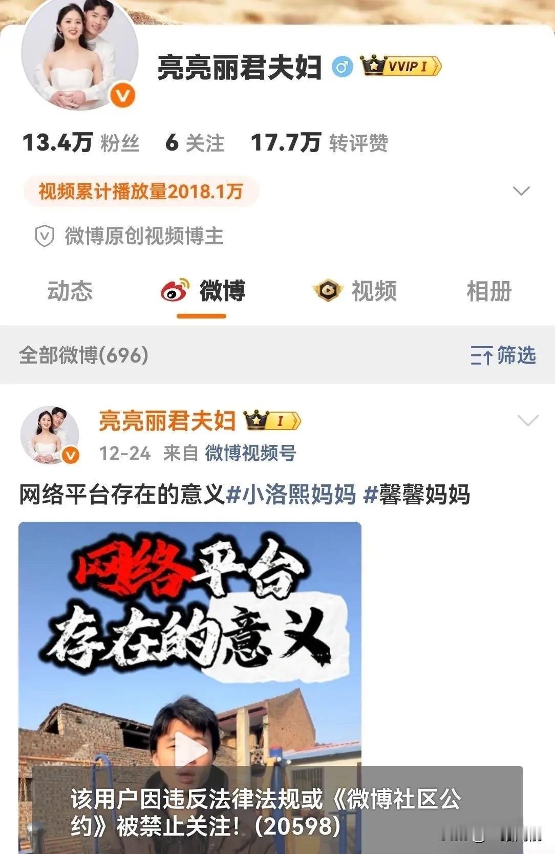 亮亮丽君夫妇的账号真的被全网封禁了,抖音、小红书、微博、B站等平台全没了踪迹,而封禁原因也很明确:触碰了中央网信办刚发布的《网络名人账号行为负面清单》里的两条红线:“鼓动群体对立”和“组织约架论战”。 这对夫妻的走红之路其实挺让人感慨的。2021年因为一句“从此万家灯火,终有一盏只为我而亮”,分享郑州买房还贷的日常圈粉无数,巅峰时抖音账号35万粉丝、500多万获赞,2.5亿的播放量,成了很多人心中“努力打拼的普通人代表”。后来遭遇楼盘烂尾、售楼部维权被打,更是引发全网同情,一度被网友力挺。 可谁能想到,走红后的一系列操作却慢慢跑偏了。从推荐有问题的月子中心后火速撇清关系,到推荐中医治癌被质疑后挂人网暴,再到直播带货樱桃时违规私域引流被封橱窗,争议越来越多。而这次触发封禁的核心,就是他们后期的内容越来越爱蹭热点、挑矛盾——借着维权的由头发表片面言论,标签化炒作事件,引导粉丝跟不同意见者互撕,甚至组织线上论战,完全踩中了“鼓动群体对立”“组织约架论战”的禁区。 中央网信办12月25日刚发布的负面清单里,早就明确划定了网络名人的行为边界,就是怕有人借着影响力挑动网络戾气、占用公共资源。亮亮丽君夫妇显然没守住底线,他们把“流量”看得太重,甚至有人爆料亮圣曾说“平平淡淡经营就没流量了”,为了红连基本的规范都抛在脑后。 其实网友一开始支持他们,是共情普通人的困境,希望他们能通过合法途径维权。可他们却把这份支持当成了流量密码,不断制造对立、引发争议,慢慢消耗了大家的信任。从让人同情的买房人,到被全网封禁的网红,这结局真的太唏嘘。