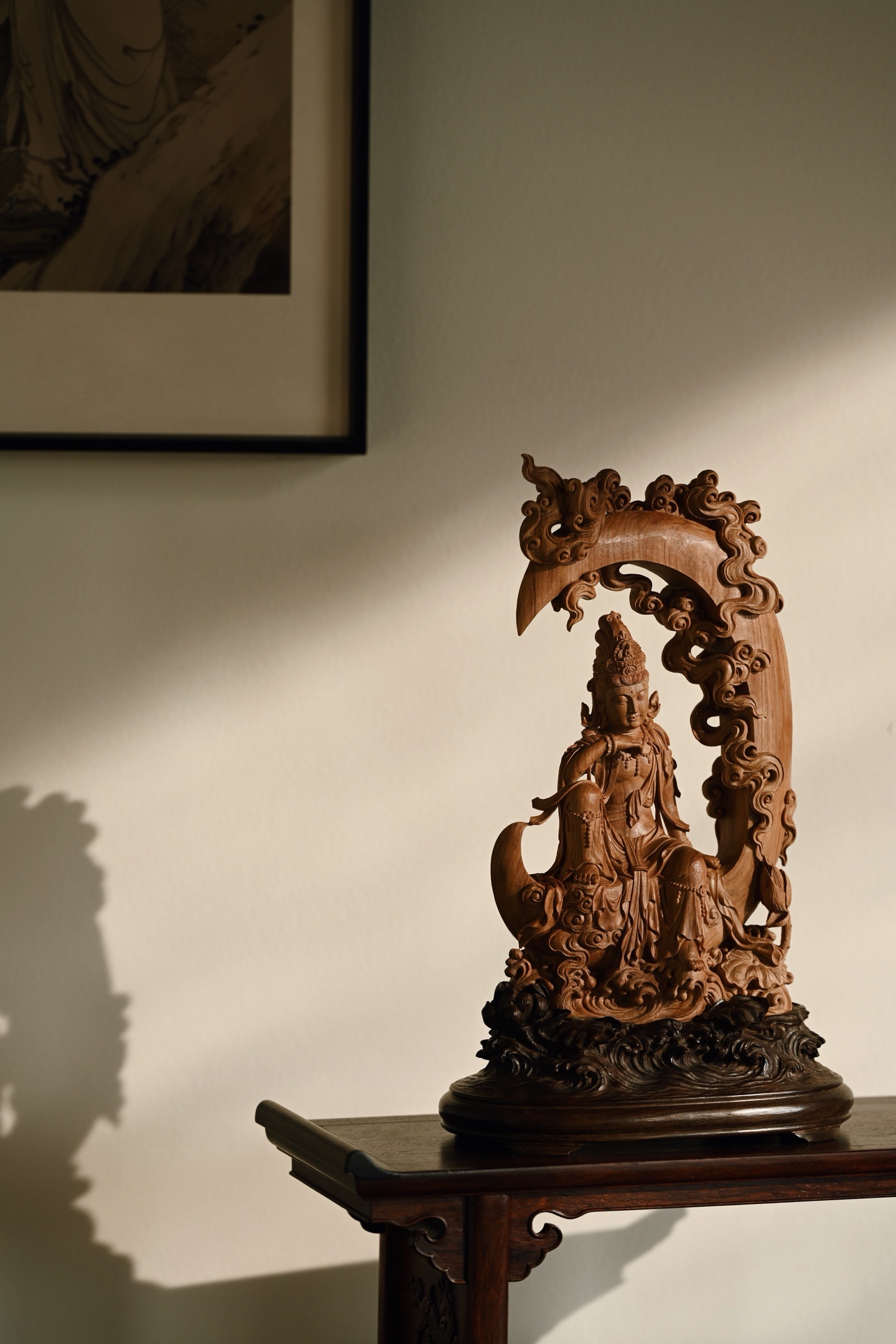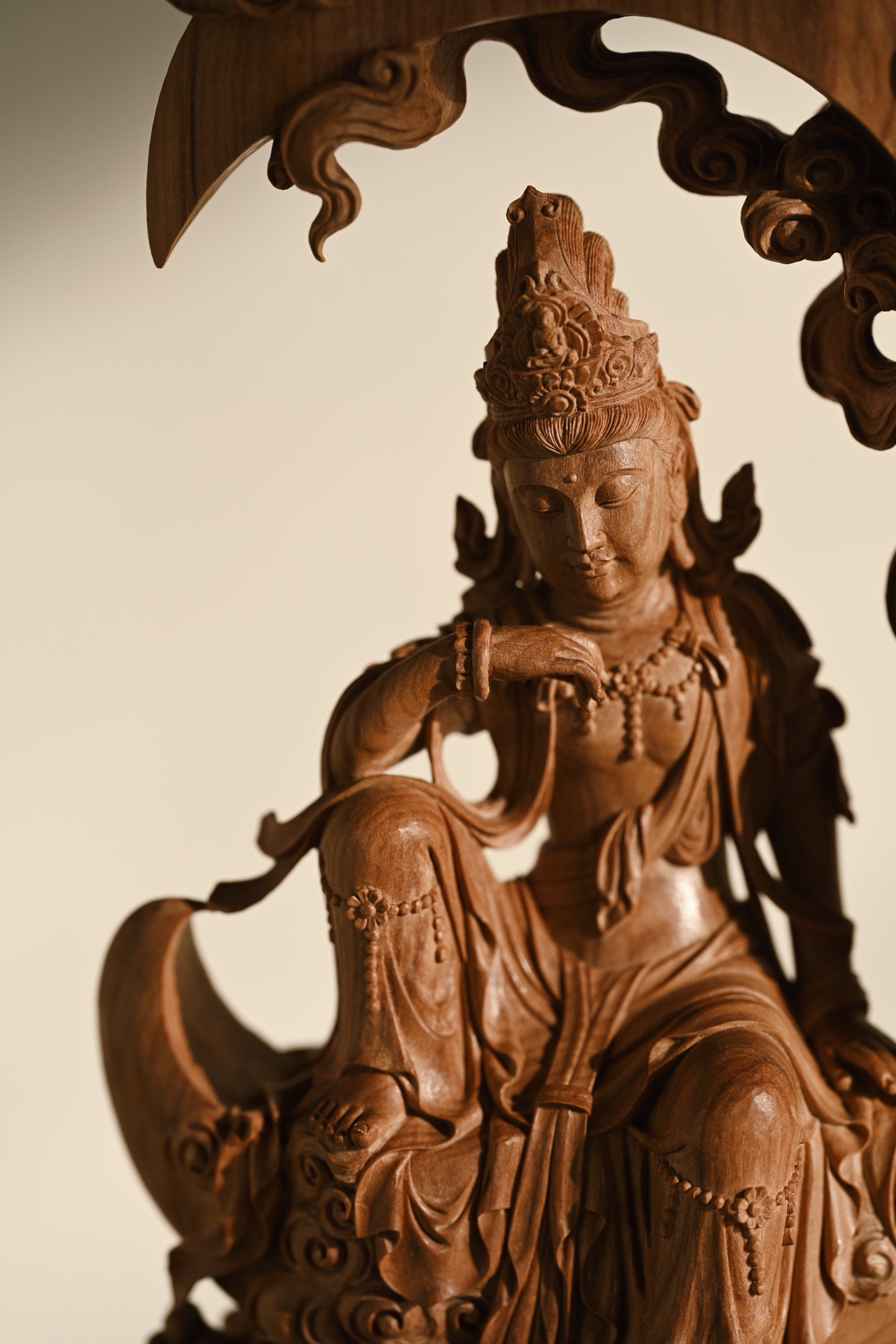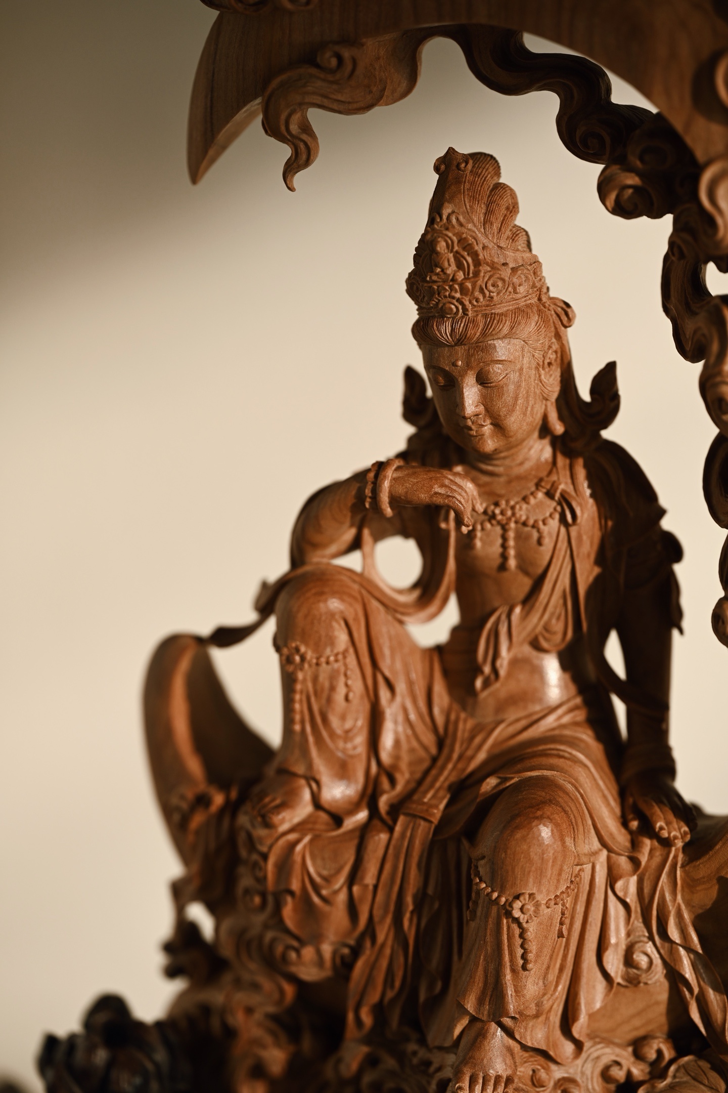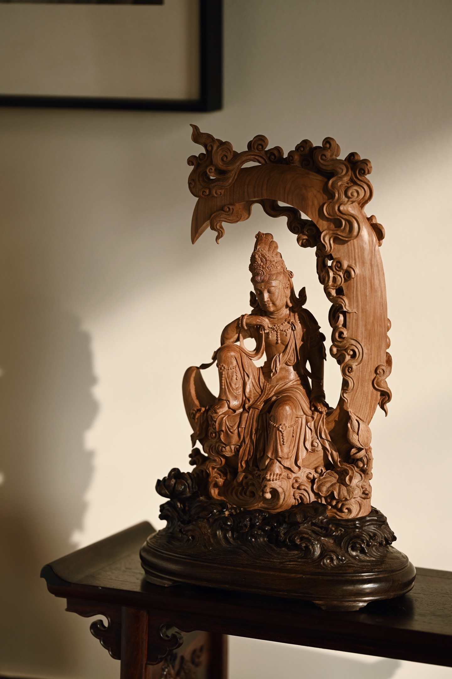 老山檀 | 自在观音开脸柔美传神,观音自在而坐,气韵清逸脱俗,垂眸静观众生,身姿柔美,弯月如盖,祥云瑞彩,生机盎然,慈悲庄严19.5*11.5*31.5cm 1502g
