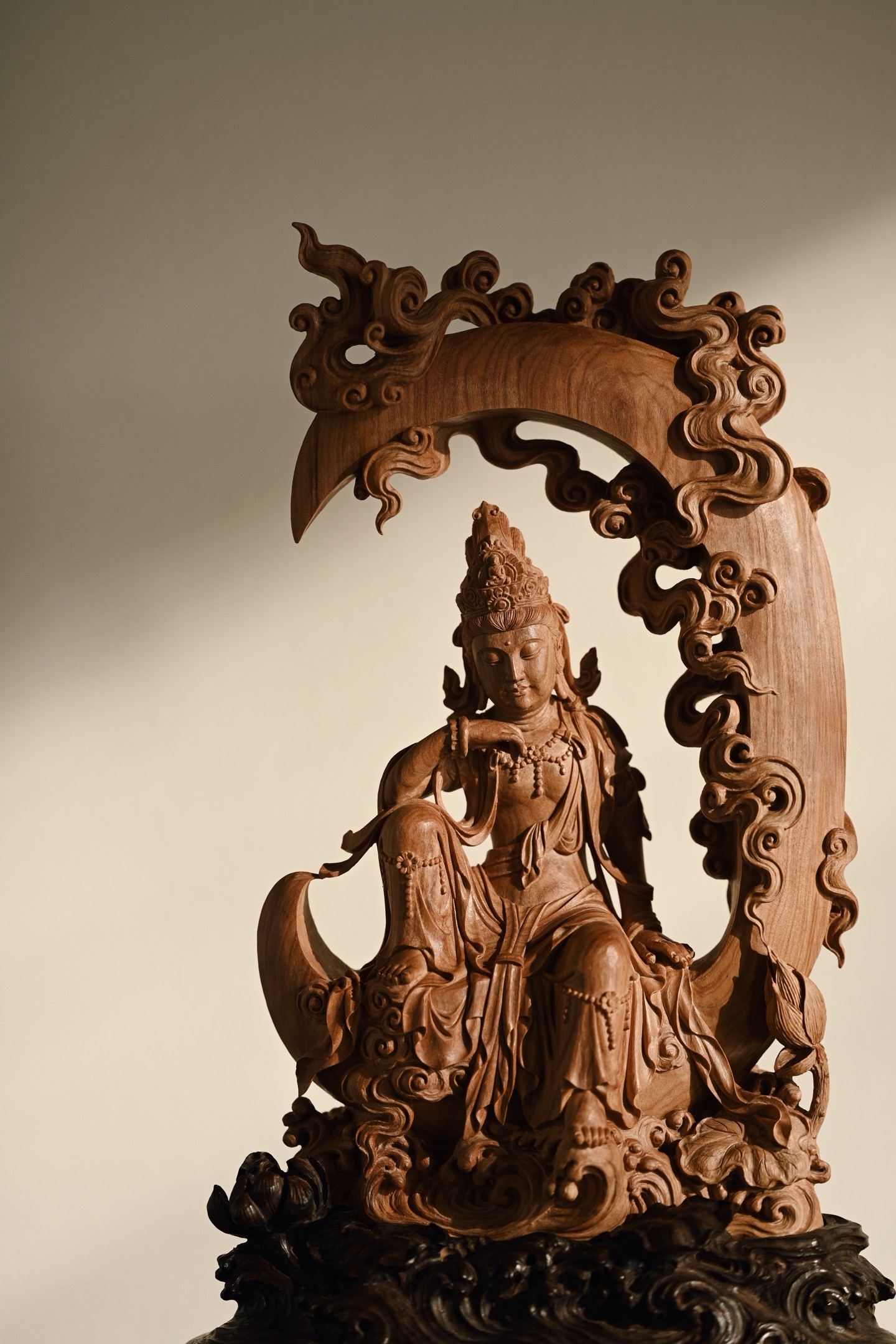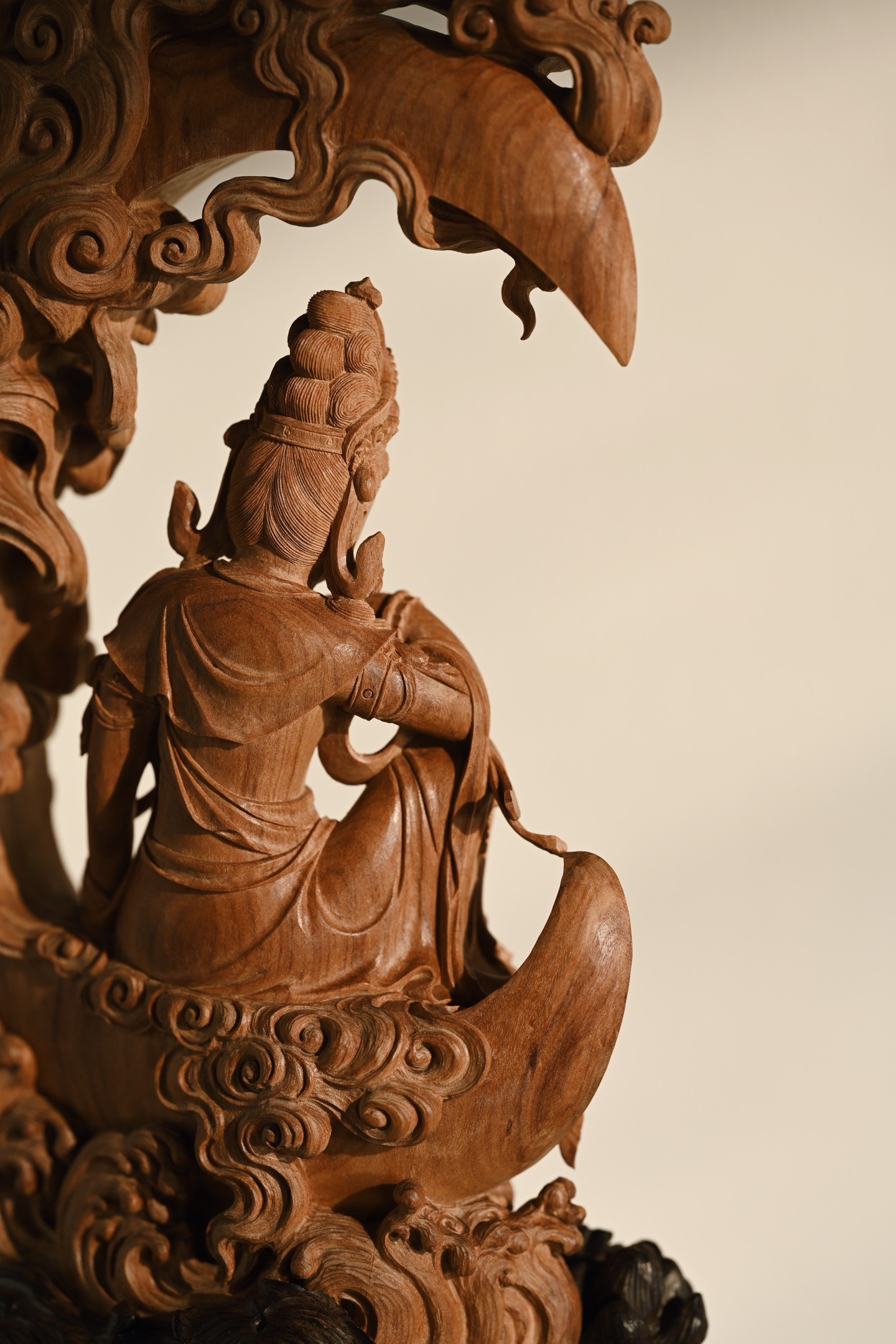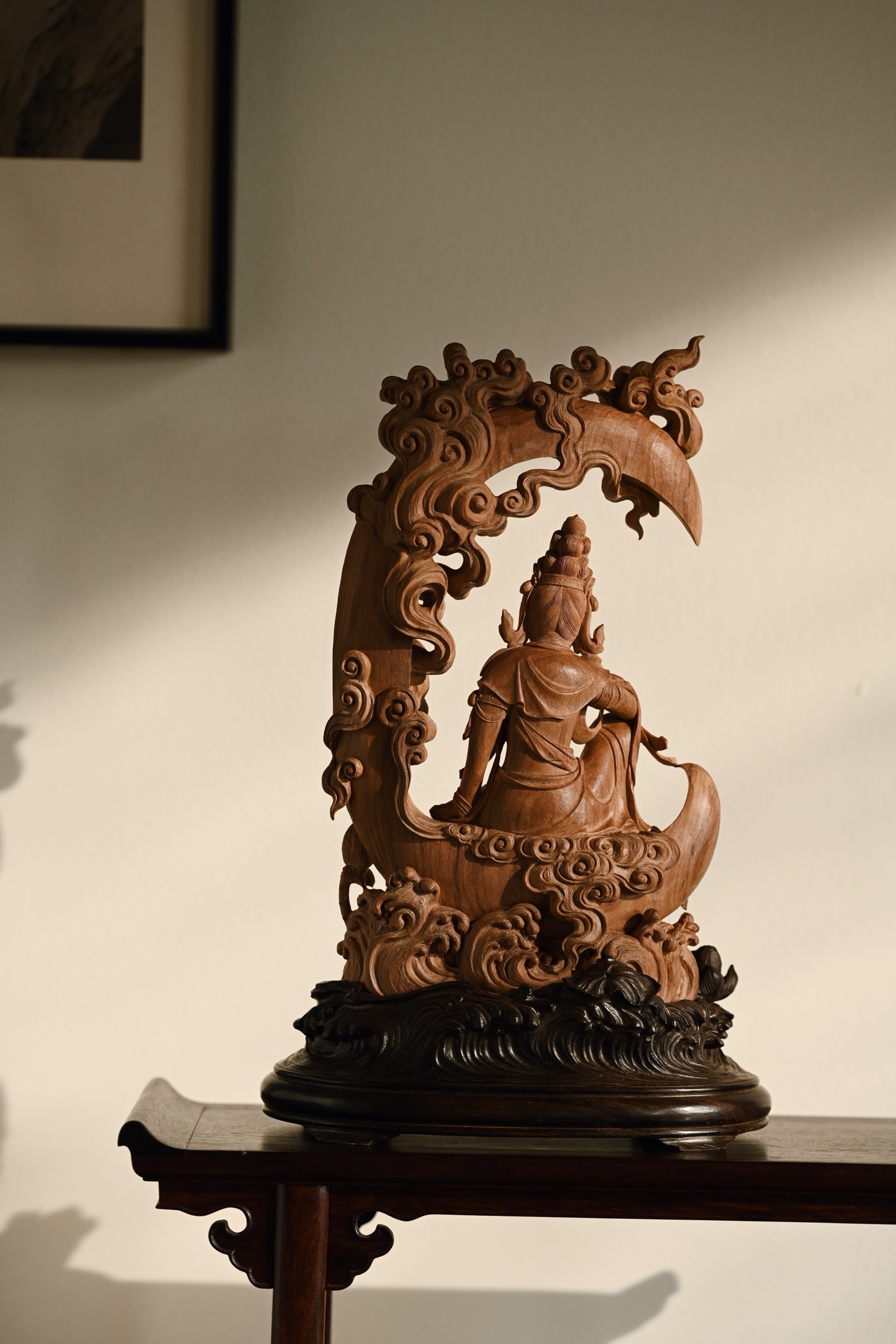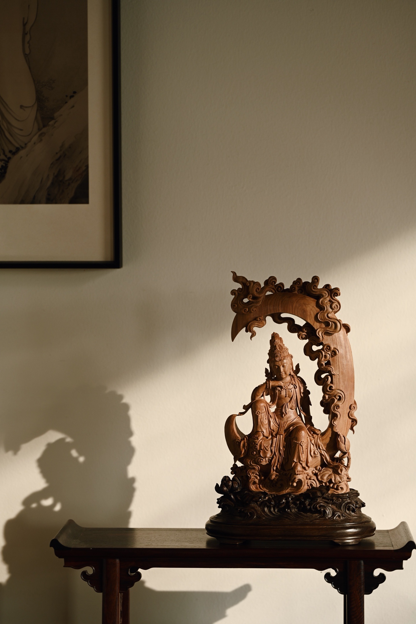 老山檀 | 自在观音开脸柔美传神,观音自在而坐,气韵清逸脱俗,垂眸静观众生,身姿柔美,弯月如盖,祥云瑞彩,生机盎然,慈悲庄严19.5*11.5*31.5cm 1502g