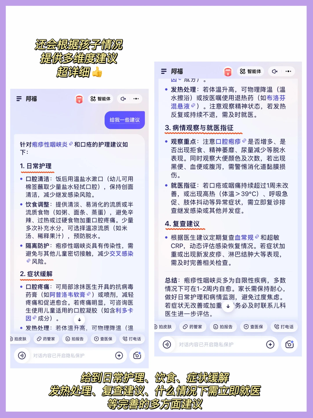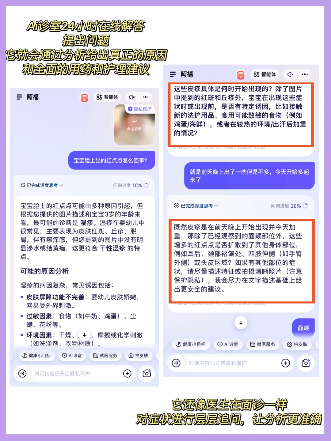 有一次二宝脸上起红点,我拍了照上传,阿福马上分析可能是干性湿疹,接着追问我有没有扩散到其他身体部位、用过什么药等,并详细建议保湿、调节室内温湿度、避免接触毛绒玩具等等,真的感觉像有人陪我一起把问题理清楚,再一步步教我怎么做。